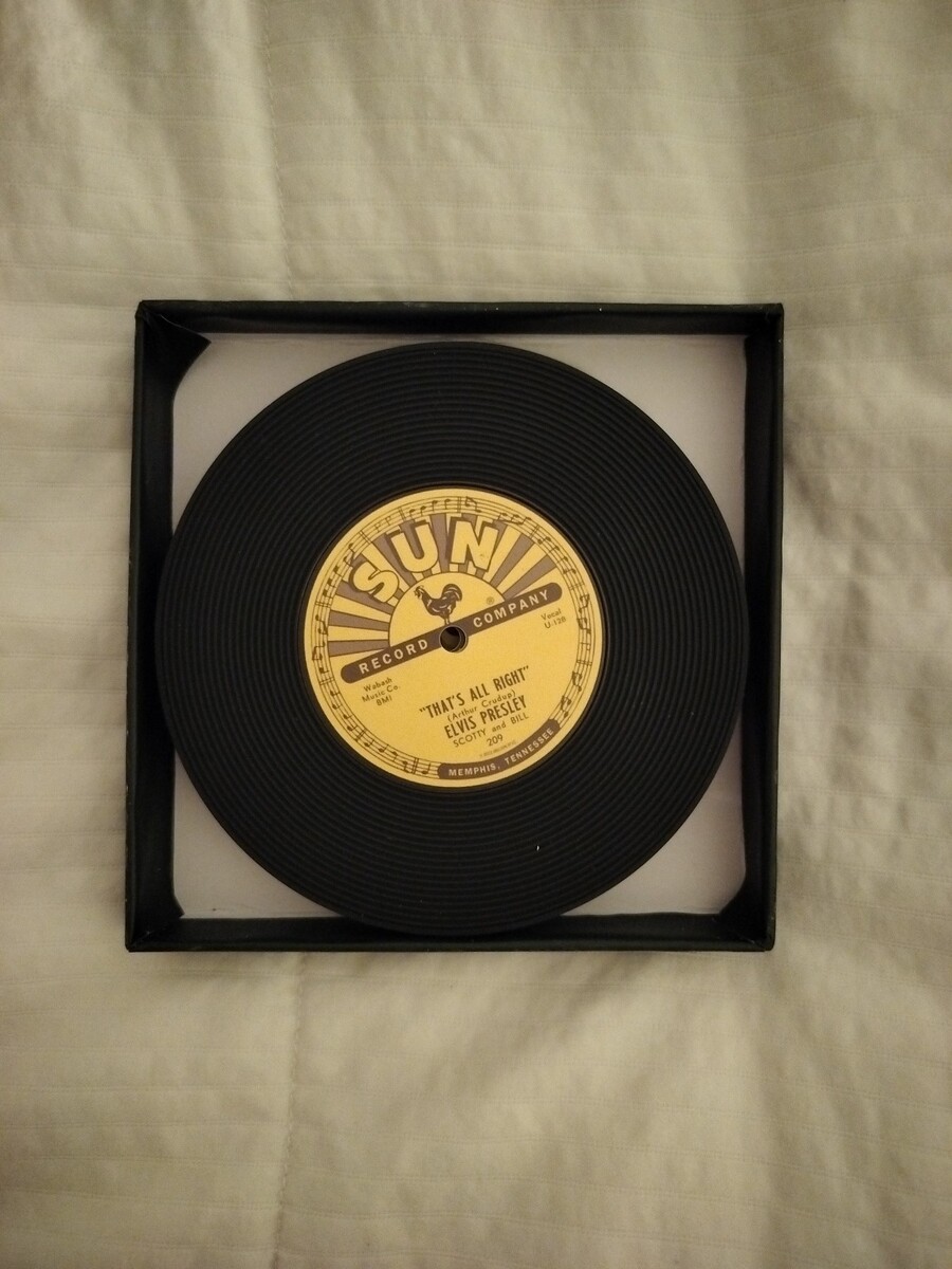 Sun Record Company "Where Rock 'N' Roll Was Born". It contains a set of 4 coasters in the shape and style of a vinyl record.