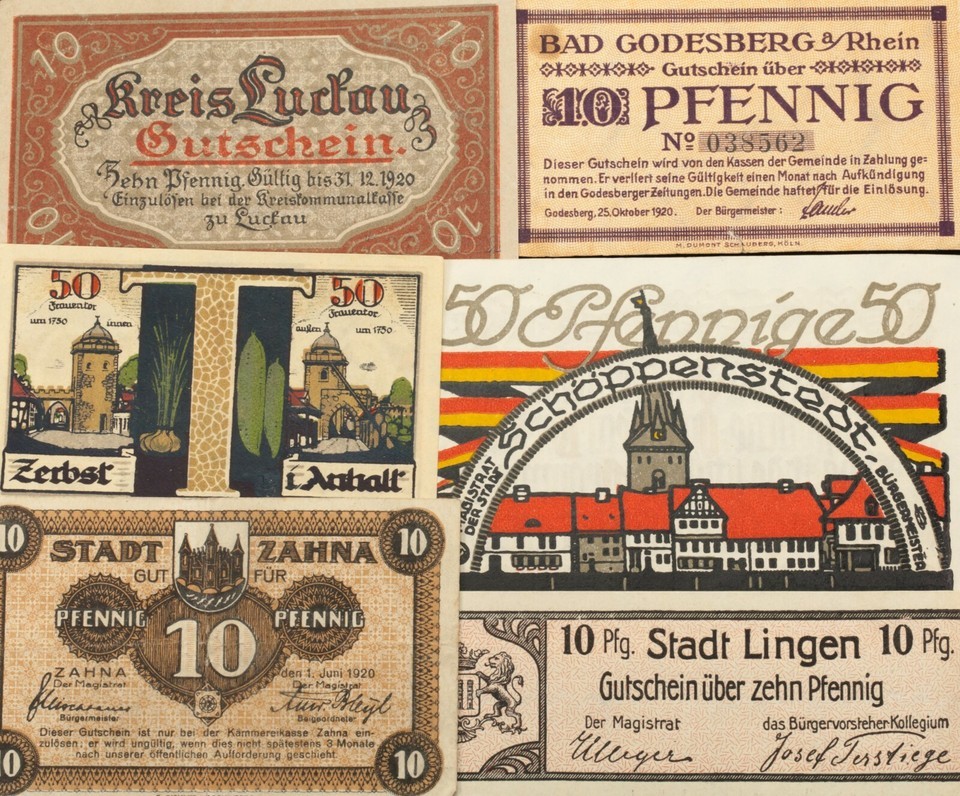 This lot will include 26 individual notgeld notes from Germany after World War I. All will be in Good to Uncirculated (G-UNC) condition. Face values between 5 pfennig to 5 mark.