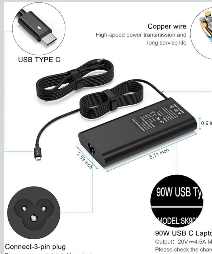 90W USB-C Type-C AC Adapter AD200450 Output 5/9/15/20 V. 3A/4.5A