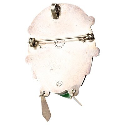 Sterling Silver & Green Calcite Mexican Taxco Aztec Mask Figure Brooch