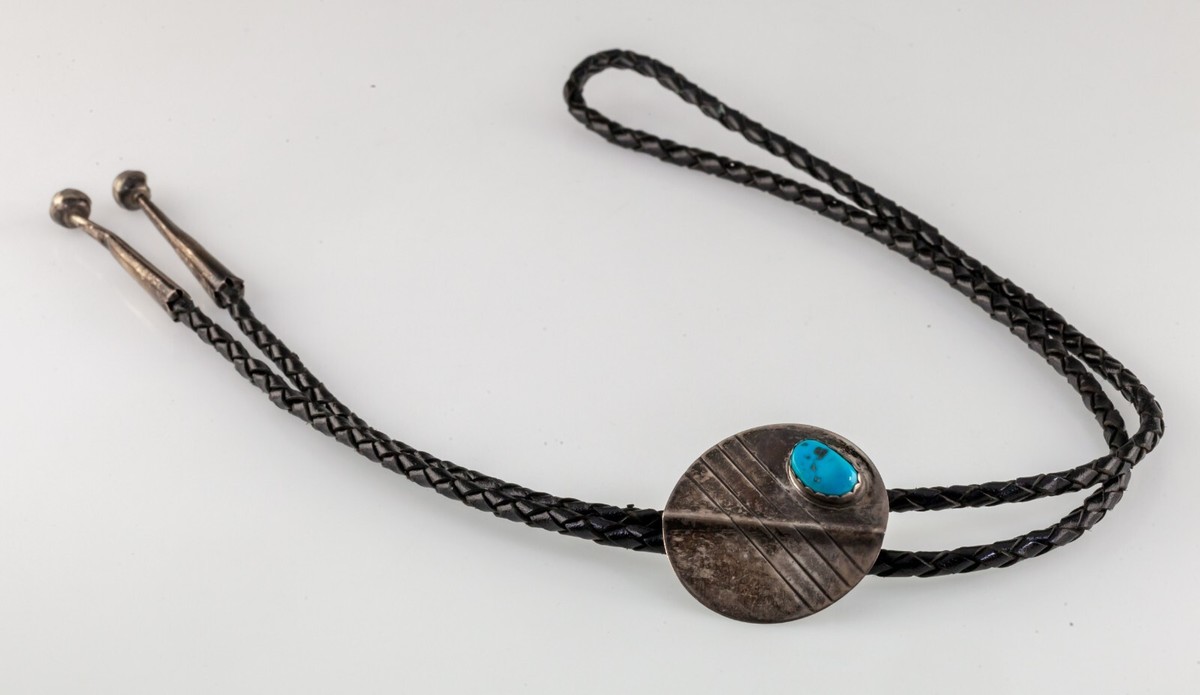 Corbata Bolo De Plata Esterlina Con Turquesa Y Cuero Trenzado, Un Aglet Faltante