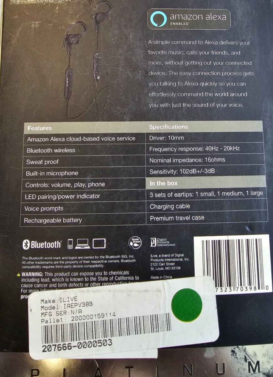 iLive Platinum Wireless Earbuds HandsFree Bluetooth Ear Hook Neck Alexa Running