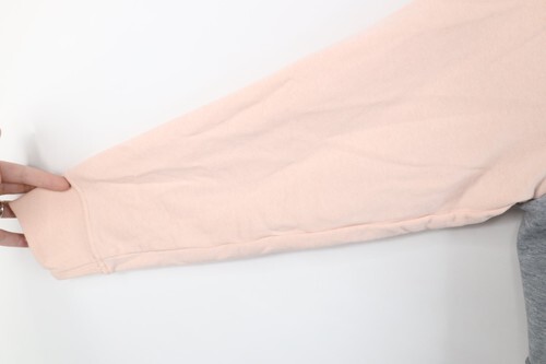 Hole bottom hem. Loose threads/discoloring cuffs. Stain front. Dark spots throughout. Design distressed. String distressed, missing metal ring. Hood, cuffs discolored. Color faded. Pilling. Bottom waist hem resewn in the back bottom.