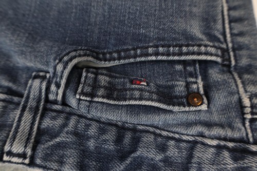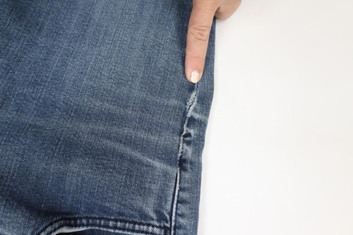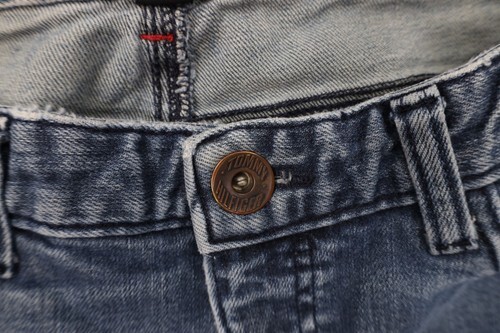 Thread bare fly, waist, pockets, cuffs. Hole right side. Threadbare both sides. Discolored, distressed and faded