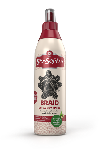 Sta-Sof-Fro Braid Spray Extra Dry 350ml provides your hair, extensions or braids with additional moisture to eliminate dryness and provide shine. Also contains chamomile to soothe itchy scalps and UV protection to limit sun damage.