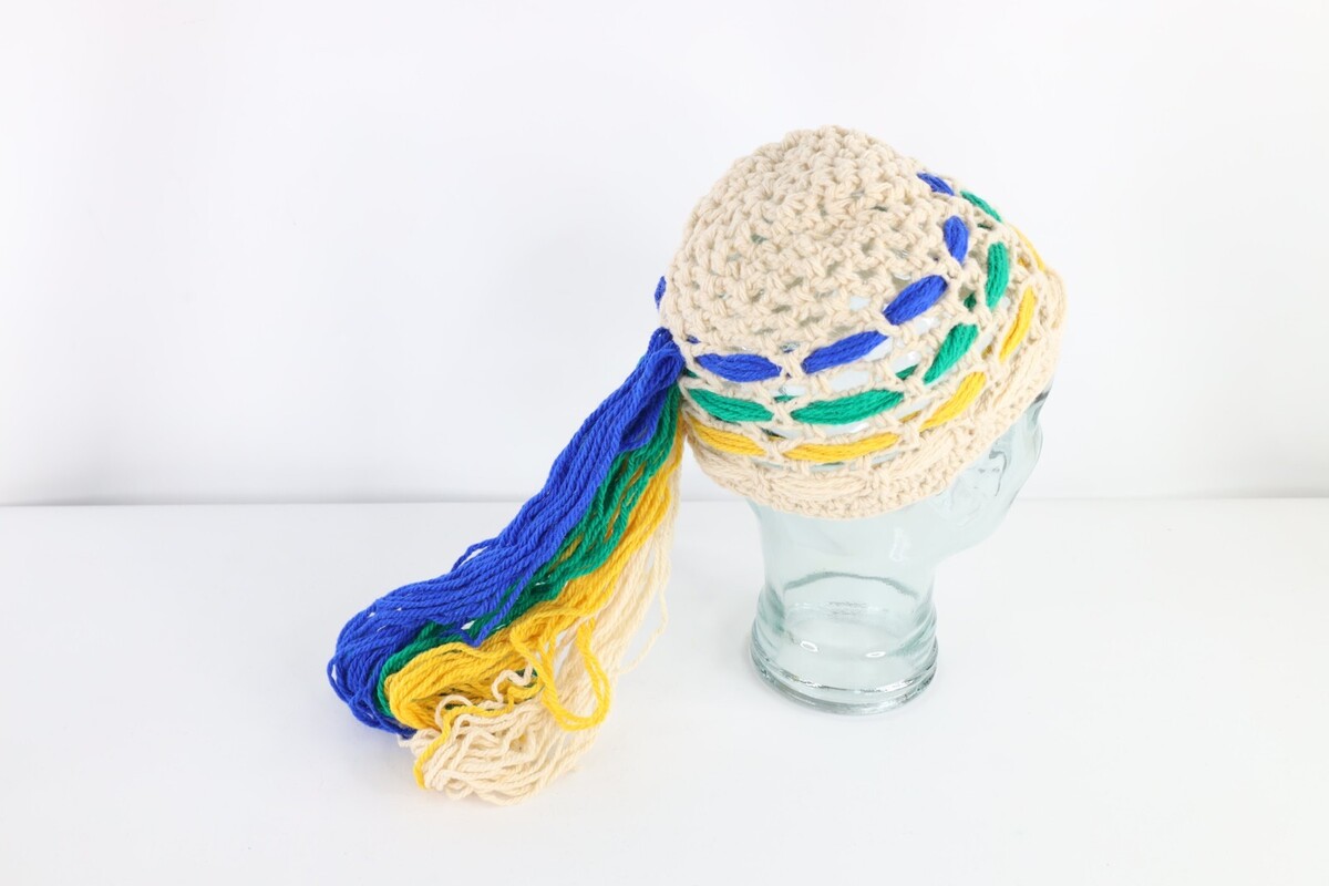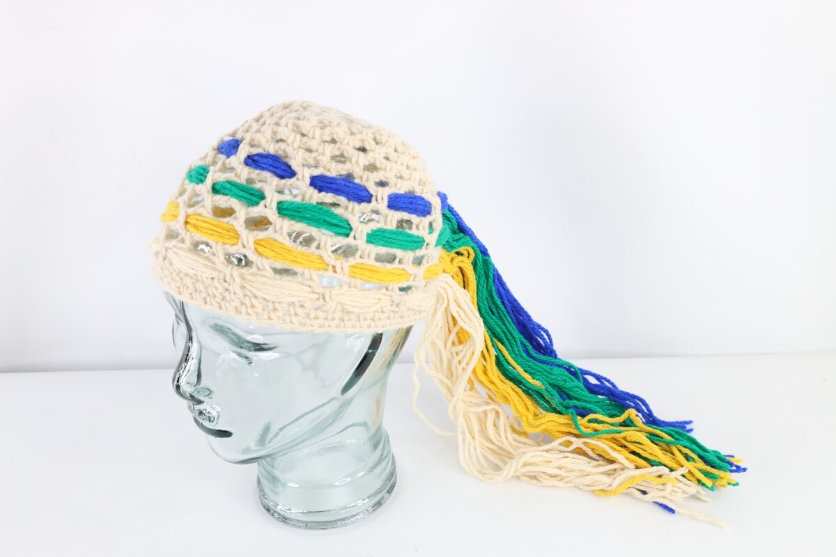 NOS Vintage 60s Streetwear Wool Crochet Fringed Beanie Hat Cap Womens OS Italy