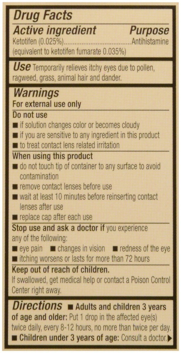Expiration Date of 3/2027 ? Fast-acting, long-lasting eye itch relief ? The first over-the-counter eye drops that temporarily relieves itchy eyes for up to 12 hours with just one drop. ? Original prescription-strength formula doesn?t use a vasoconstrictor ? Doesn?t use a vasoconstrictor ? Safe and effective for children aged 3 years and older*.