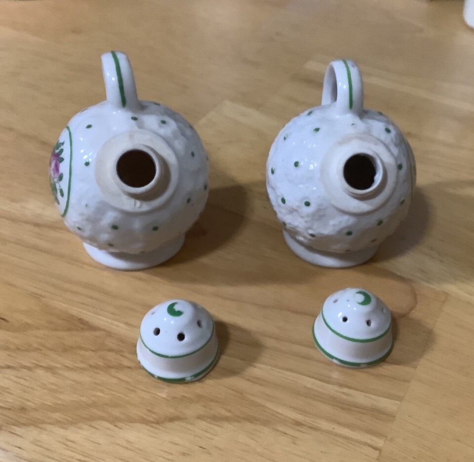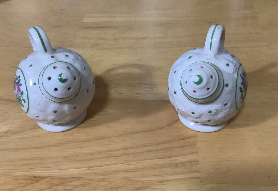 Set of porcelain tea pot salt and pepper shakers. Hand painted in Japan. The spouts unscrew for filling. 2 1/2 inches tall wide. White with painted green accents and lavender flowers on one side. No chips, paint is slightly rubbed in a few spots. Maker isn?t stated, but there is a trade mark on the bottom. Overall good condition. Feel free to email with questions. I do combine shipping on multiple orders. Have a great day!