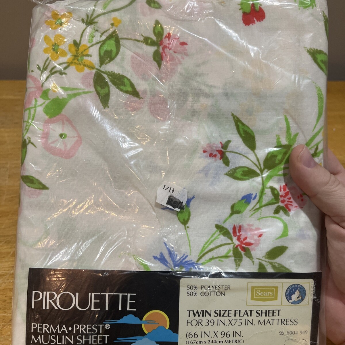 This vintage Pirouette Floral Country Cottage Twin Flat Sheet by Sears is a collectible piece of bed and bath linen. Featuring a charming floral pattern in a multicolor design, this machine washable flat sheet is made from a blend of 50% cotton and 50% polyester. Measuring 96 inches in length and 66 inches in width, this retro piece exudes a country cottage style with a theme of flowers, perfect for adding a touch of nostalgia to any bedroom or collection.