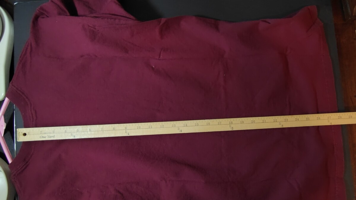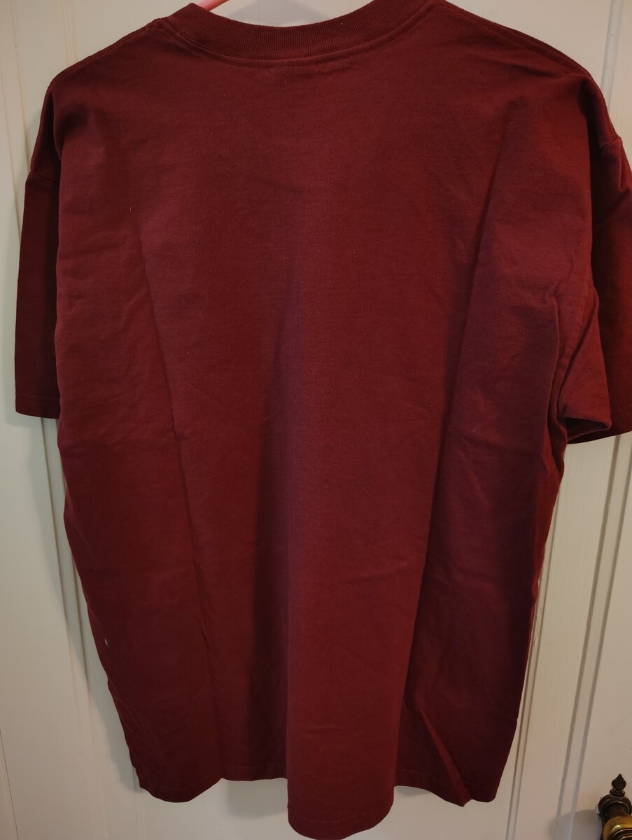 Printed on a Gildan Ultra Cotton maroon tee in size Large. The true color is a deep, dark maroon (ketchup-like) that is richer in person; the camera made it look slightly brighter.