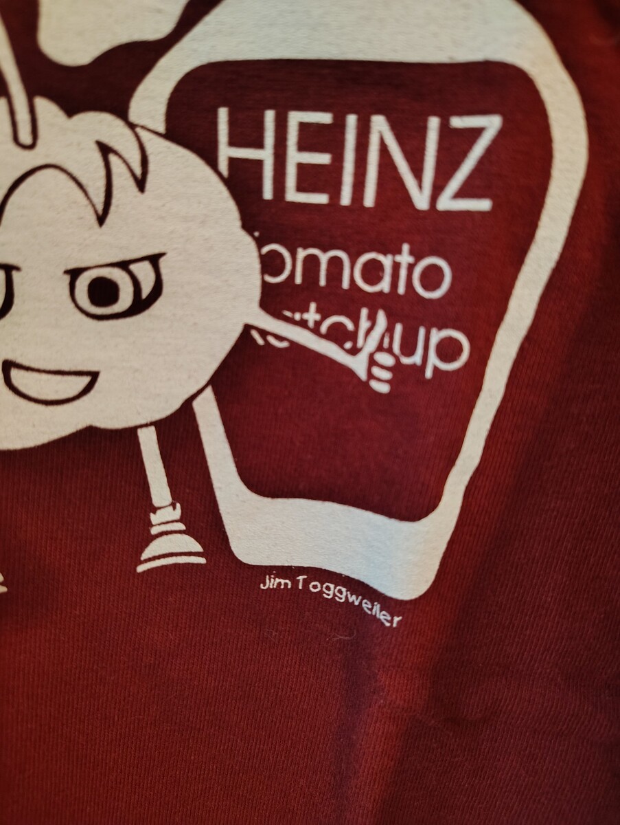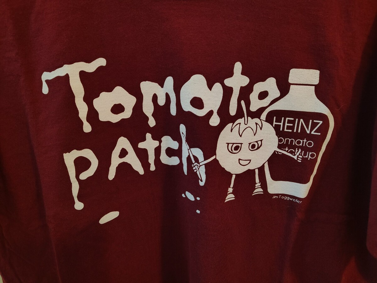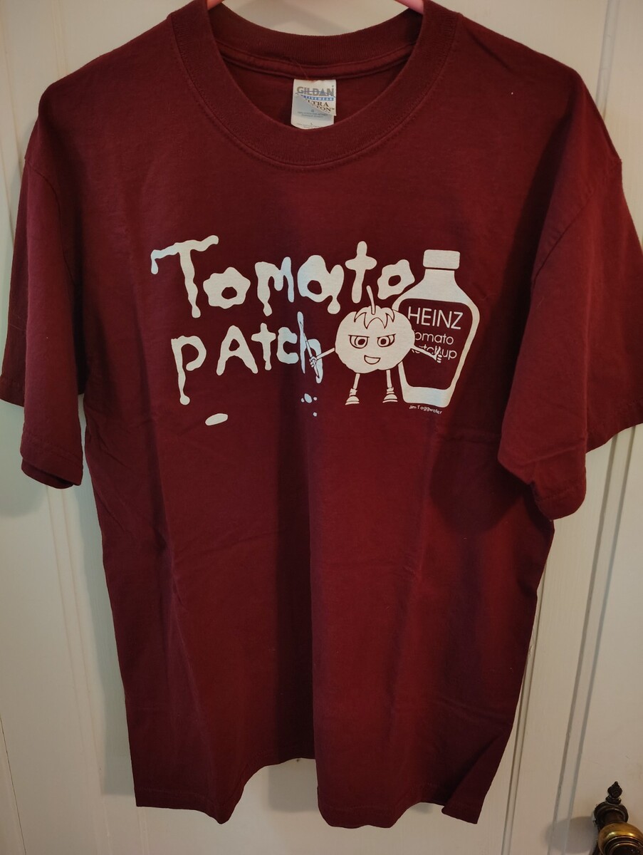 This is a unique independent-artist T-shirt featuring a fun ?Tomato Patch? cartoon design next to a Heinz ketchup bottle, illustrated and signed by Jim Toggweiler. This does not appear to be official Heinz merchandise ? it?s likely a small-batch parody or a local event/festival print, which makes it harder to find.