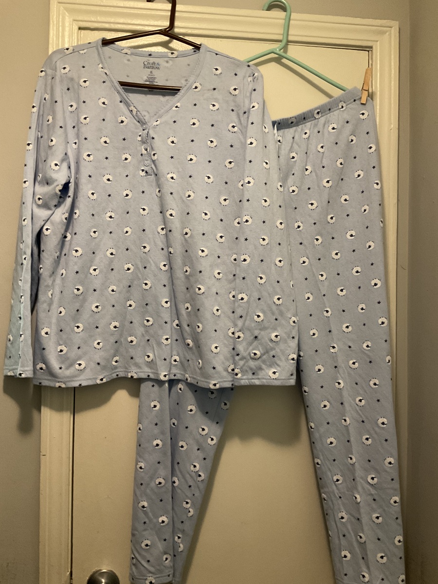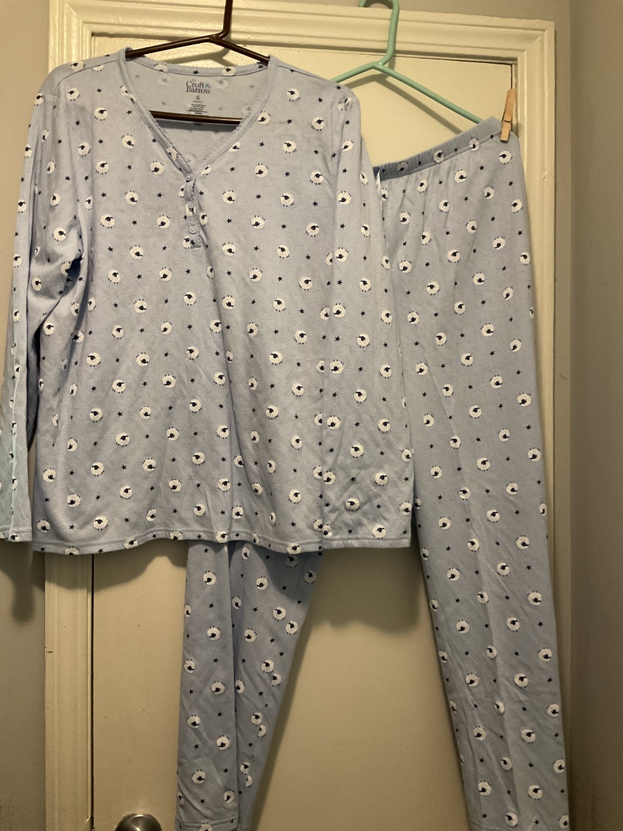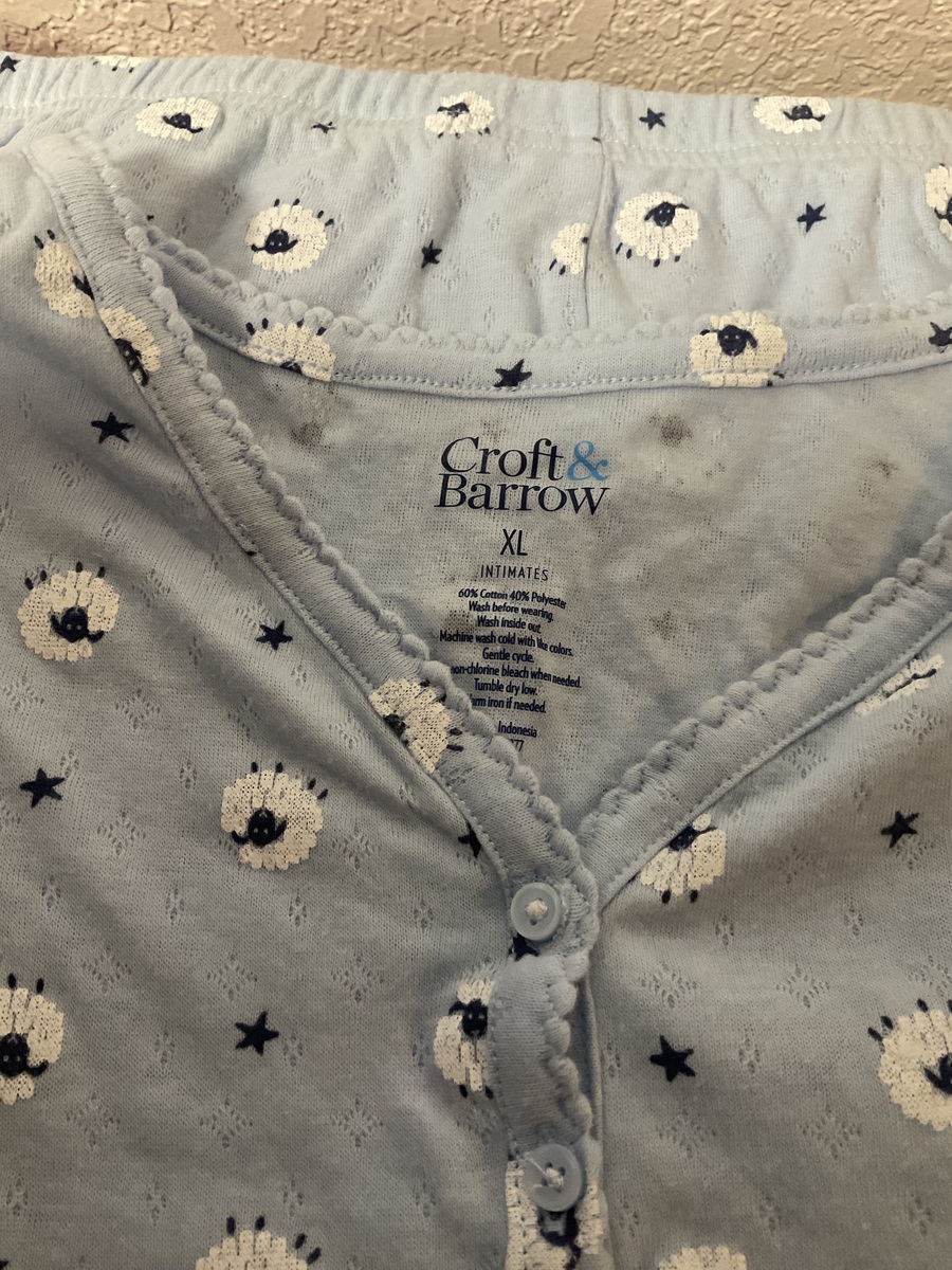 This listing is for a women’s Croft Barrow XL long sleeve pajama set featuring plenty of sheep. It’s 60% cotton and 40% polyester. It’s perfect for those cool days which are just around the corner. Very good condition. Please see all pics as they are part of the description. It comes from my smoke free home. Sold AS IS.