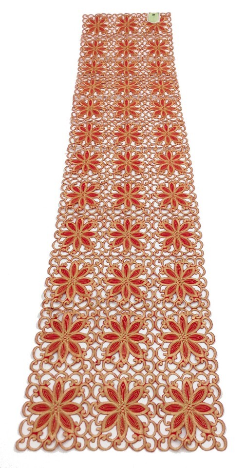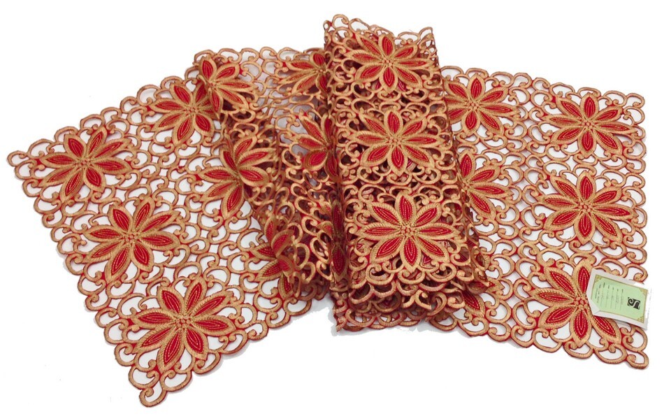 Beautiful Broderie Cutwork Collection red and gold cutout table runner. A