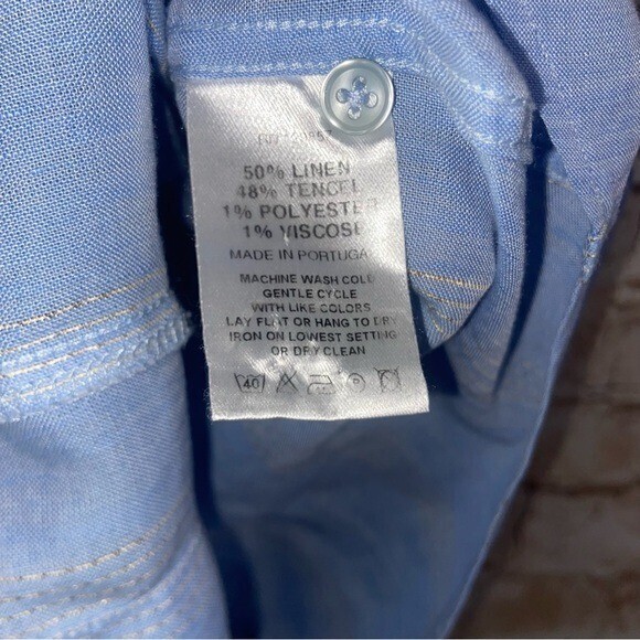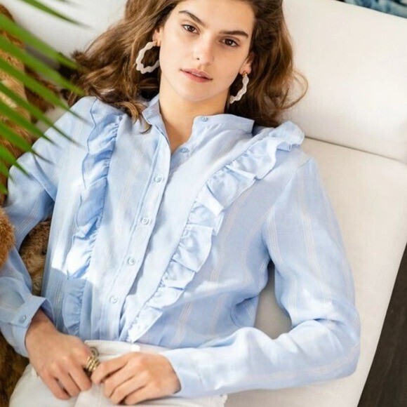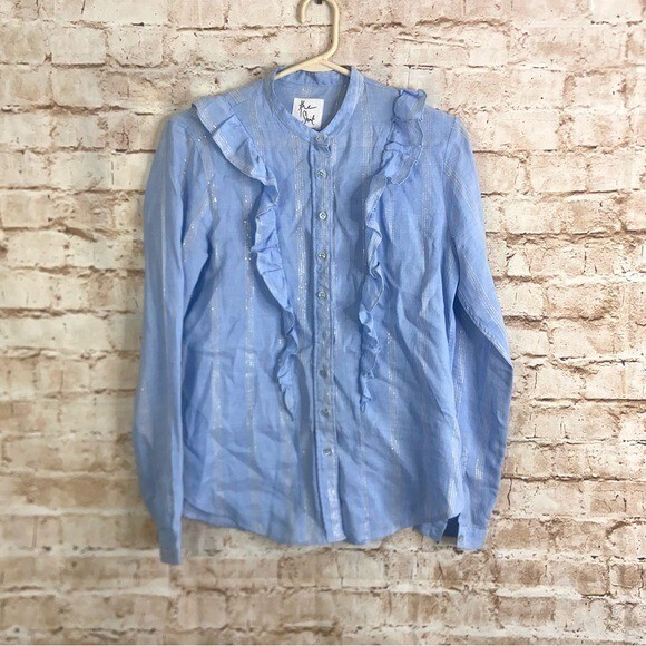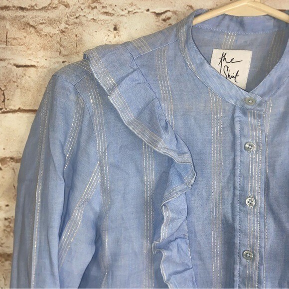 The Shirt by Rochelle Berens Ruffle Striped Shirt Size Small / 50 linen 48 Tencel 1 polyester 1 Elastane /The Ruffled Shirt is sure to become your go-to. Super flattering placement of ruffles in our otherwise tailored fit give this shirt a great shape. No Gape button technology/ Blue with silver metallic threading stripe