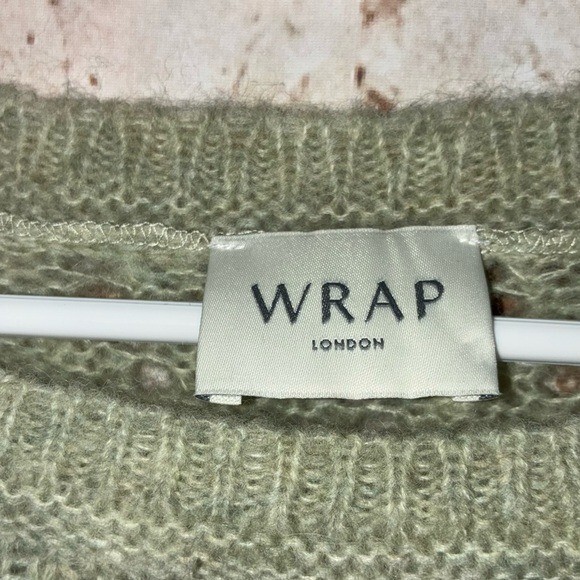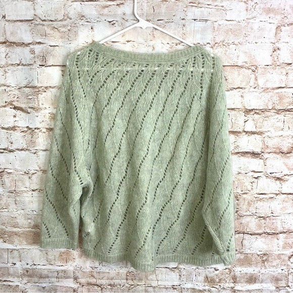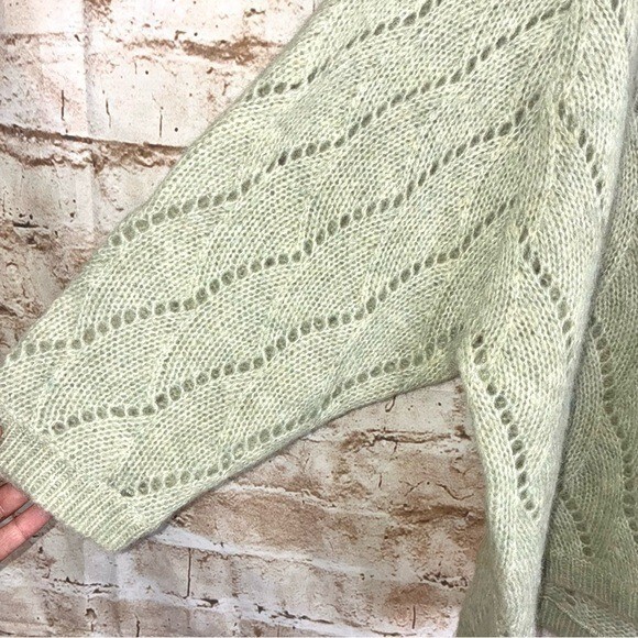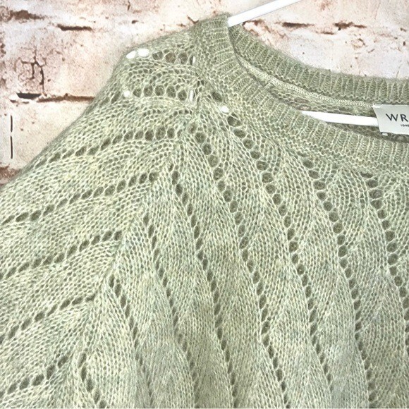 Wrap London Alpaca Merino Wool Blend Lace Stitch Sweater Size 12 - 55 baby alpaca 24 polyamide 21 merino wool - delicate eyelet stitch with round neckline and wide raglan sleeves that hit above wrist. Light green