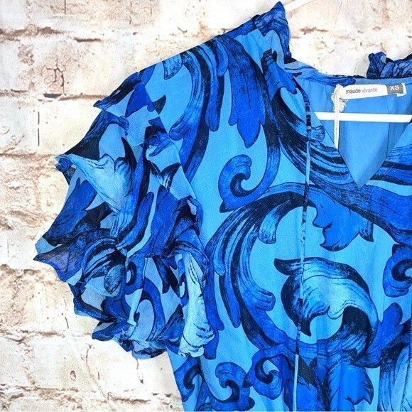 Maude Vivante Ornamental Stella Dress in Blue Size XS NEW - 100% viscose - polyester lining - maxi length, tiered ruffle skirt and ruffle sleeves