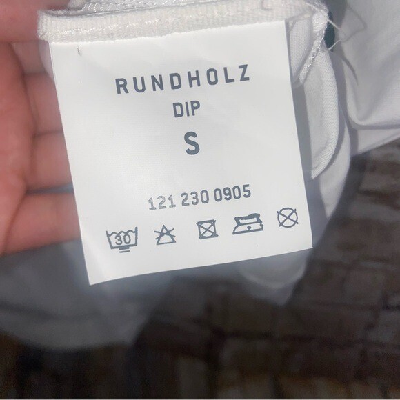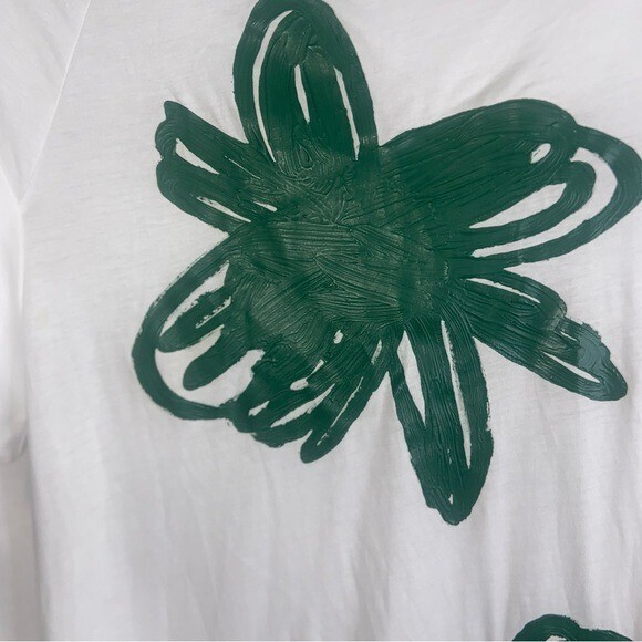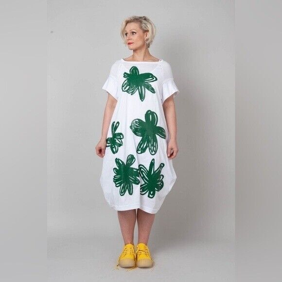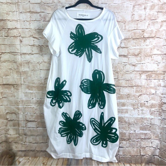 RUNDHOLZ DIP Laglenlook Green Print Handpainted Dress Size Small/ Cotton /featuring a statement handpainted flower motif on the front. Short raglan sleeves, pockets at side. White background with green print.