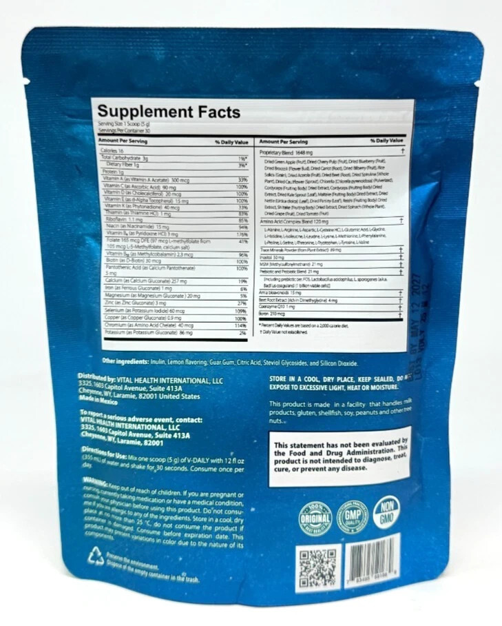 The VitalHealth V-Daily Multi-Vitamin Powder is a complete nutrition supplement