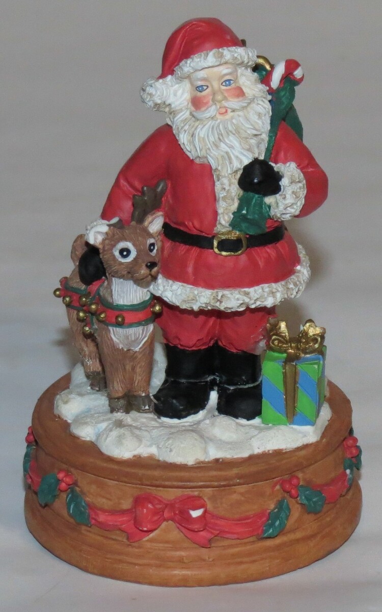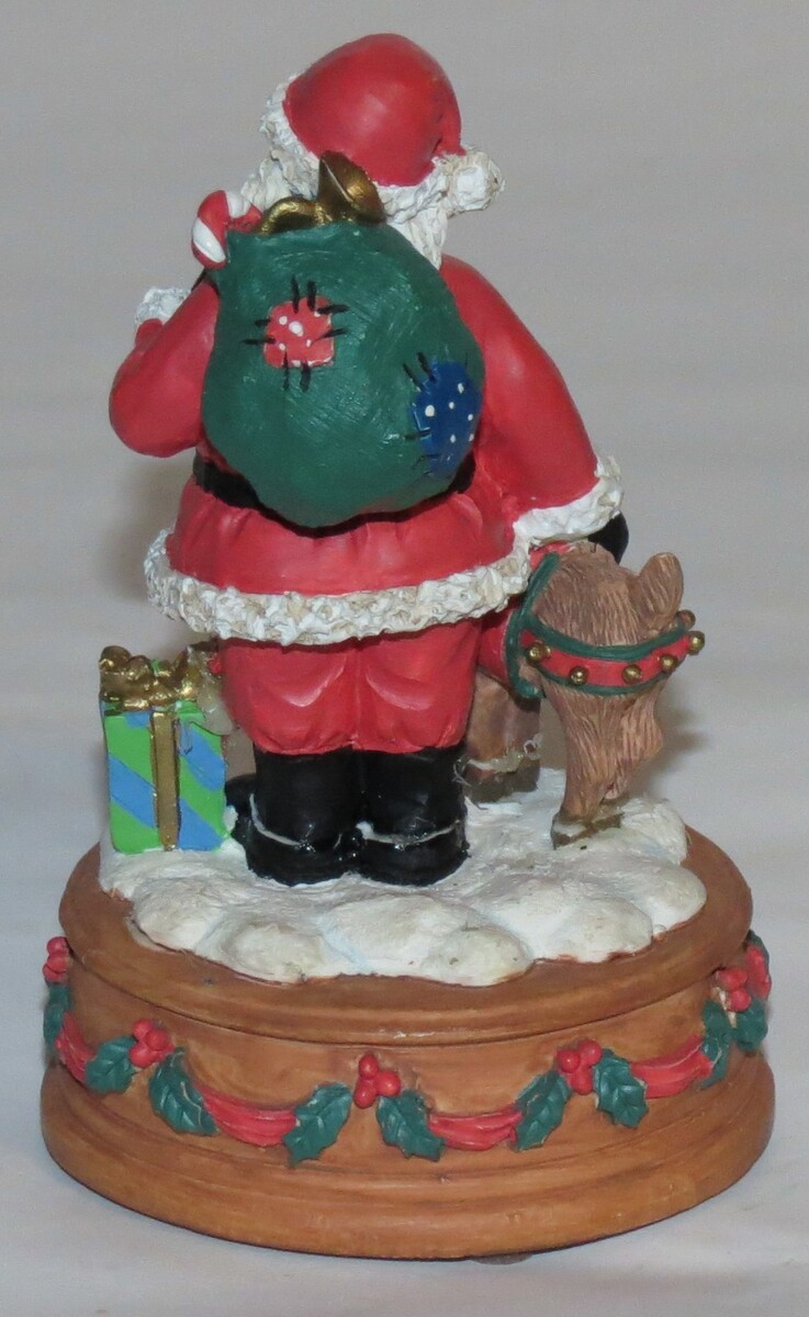 Christmas season. The resin figurine plays the song "Rudolph the Red Nosed Reindeer" and captures the magic of the holiday. Manufactured in the 1990s, this music box adds a touch of nostalgia and