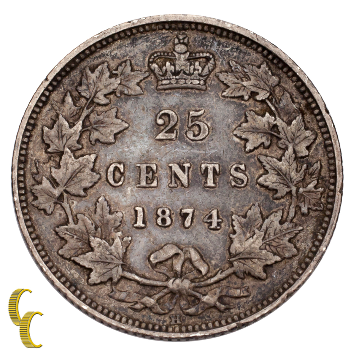 1874-H Canada 25 Cents Coin (VF) Very Fine Condition