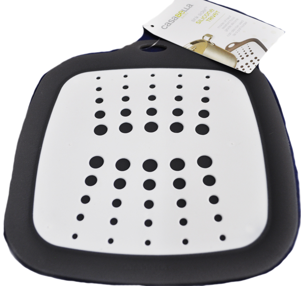 Casabella Sink Sider Trivet White Gray Sold Each Protects counters and tables from hot pots, casseroles and plates. Heat resistant food grade silicone safe to 600 degrees. Can also be used as a pot holder.