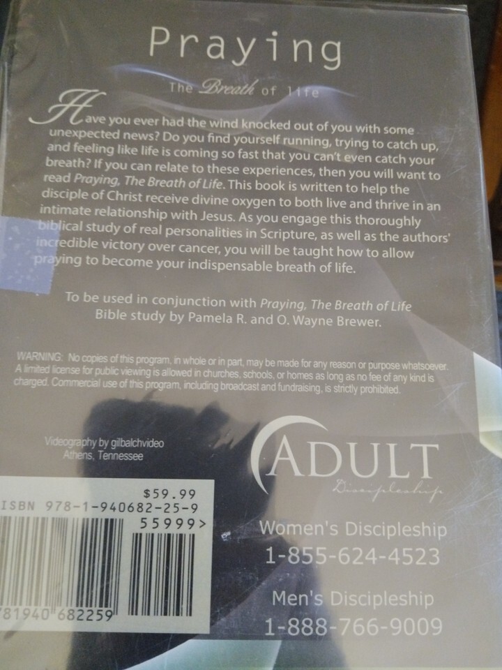"Praying, the Breath of Life : DVD by Pamela R. O. Wayne Brewer (2014, DVD)" is an inspirational textbook designed for adult and further education levels. Published by the Church of God Adult Discipleship, this DVD focuses on the subject area of religion and is written in English. With a title that emphasizes the importance of prayer in our lives, this DVD offers a unique educational experience for those seeking to explore and deepen their spiritual practices.