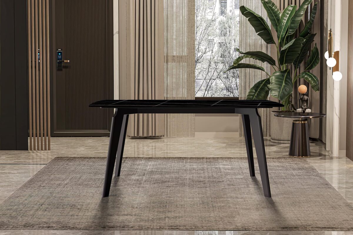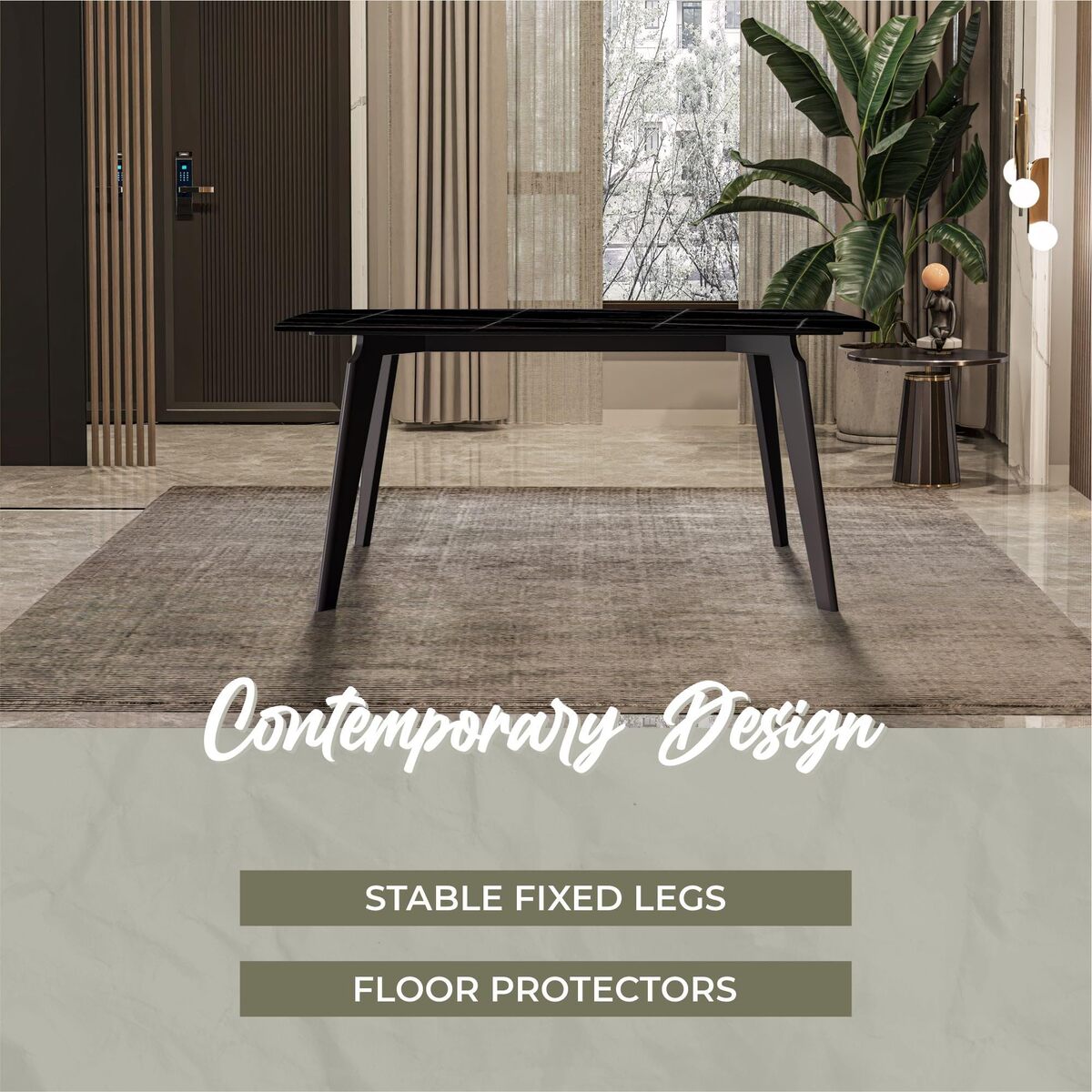 The Krevor modern dining table is a perfect fusion of style and practicality. This meticulously crafted table seamlessly blends mid-century flair with modern functionality, resulting in a timeless yet contemporary centerpiece to your home or dining space. Its spacious rectangular tabletop offers ample space, while the sleek steel legs provide stability and sophistication to any space. Crafted from premium sintered stone or glass tabletops, our modern dining table boasts advanced materials renowned for their durability and minimal upkeep requirements. The sintered stone surface provides heat and scratch resistance while the glass provides sophistication with its sleek and reflective surface. The dining kitchen table is supported by a robust black steel base, ensuring exceptional durability and stability for long-term use. This table offers a solid and reliable foundation for all your dining requirements, ensuring stability and dependability. Its stainless-steel base features a sleek powder coated base, offering an appearance that elevates the sophistication of your dining area. This coating enhances the table's overall elegance, making it a standout piece suitable for any setting, from formal dinners to casual gatherings. Designed for versatility and ease of use, the dining table seamlessly adapts to various environments, including kitchens, dining rooms, and pantry rooms. Its exceptional versatility enhances every dining occasion, ensuring each moment is more enjoyable and fulfilling, offering exceptional value by allowing easy customization according to your specific needs and preferences. Cleaning our dining table is a breeze thanks to the smooth tabletop surfaces and sleek rust resistant steel legs. Just wipe it down with a damp cloth to remove any stains or spills, keeping the table looking pristine. Putting up together at our dining table is a breeze. Clear instructions and all the necessary hardware are included, making assembly simple and hassle-free. You'll have your new dining table ready to enjoy in no time.