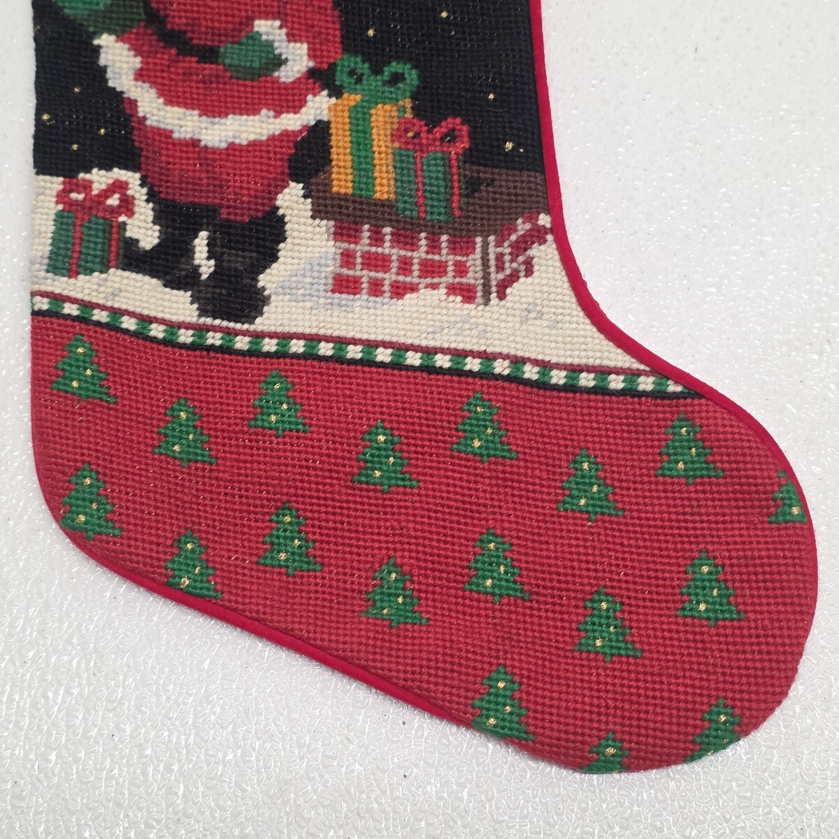 Vintage Needlepoint Christmas Stocking Santa With Presents Chimney Star. Images show actual item that will ship.
