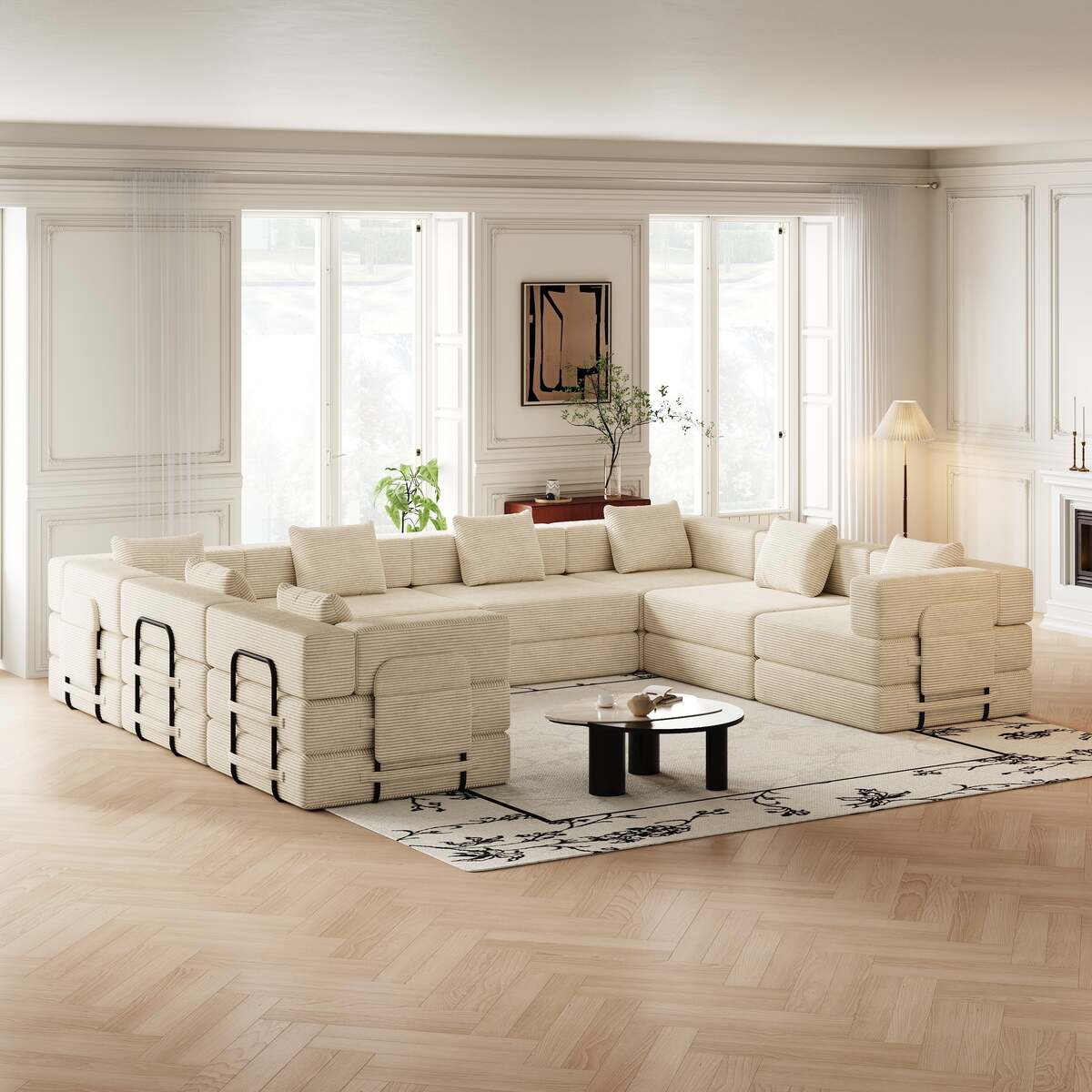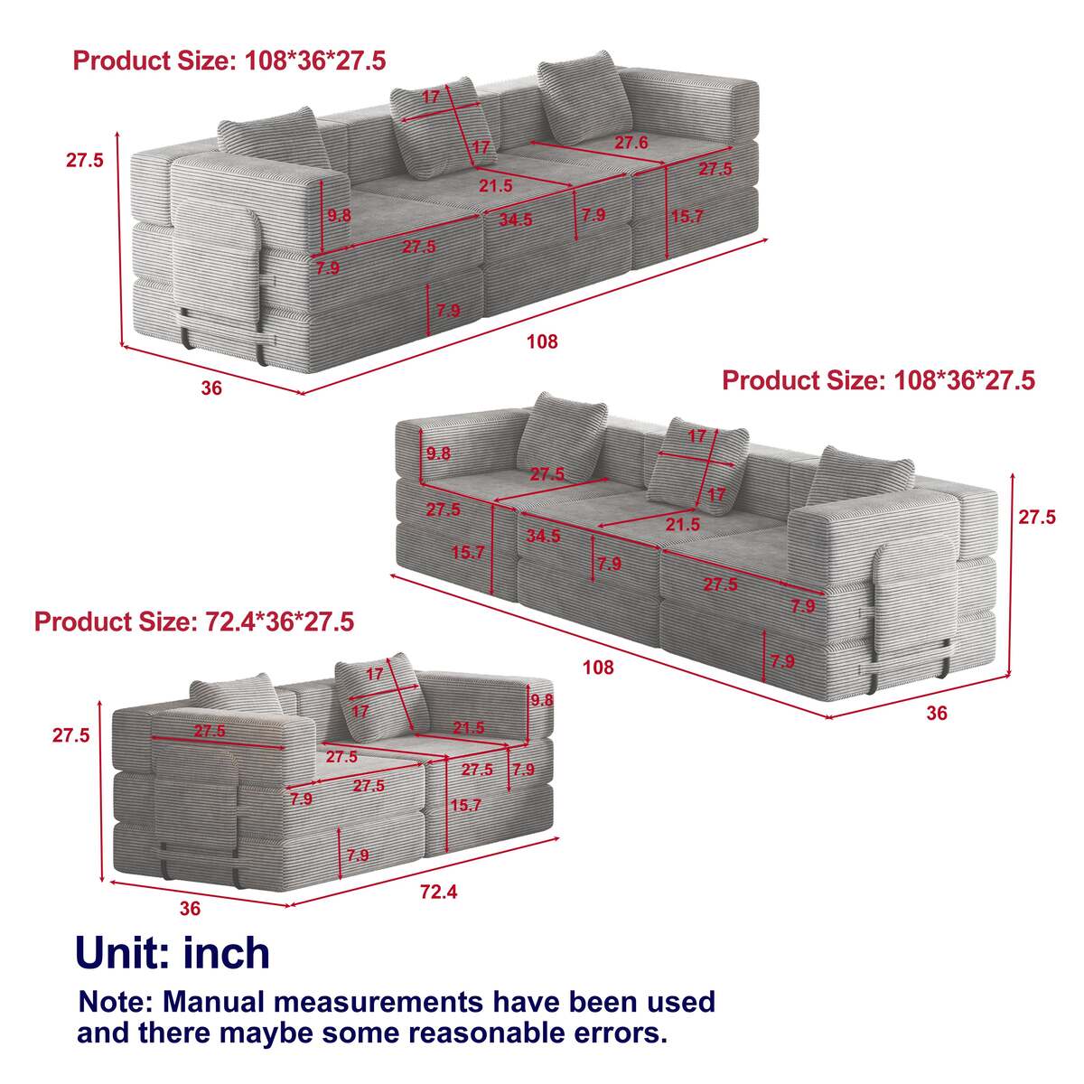 Comfortable 8-Seater Corduroy Folding Sofa Bed w/ Storage Pockets