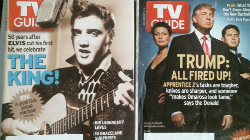 Eight back date issues of TV Guide being March 6-12, April 3-10, April 25-May 1, May 2-8, June 6-12, July 4-10, August 22-28, October 3-10 all of the year 2004 and all subscription copies. We cropped the photos short of showing the name of the original owner, not sure that having a subscription to TV Guide amounts to great personal data but it seemed the thing to do, they only passed away last year. So too late to ask them anything about them but I would describe them as slightly "garage kept" in Good to Very Good condition with some wear and blemishes. The Trump one is a bit wrinkled but the Elvis is not bad at all. Low price.