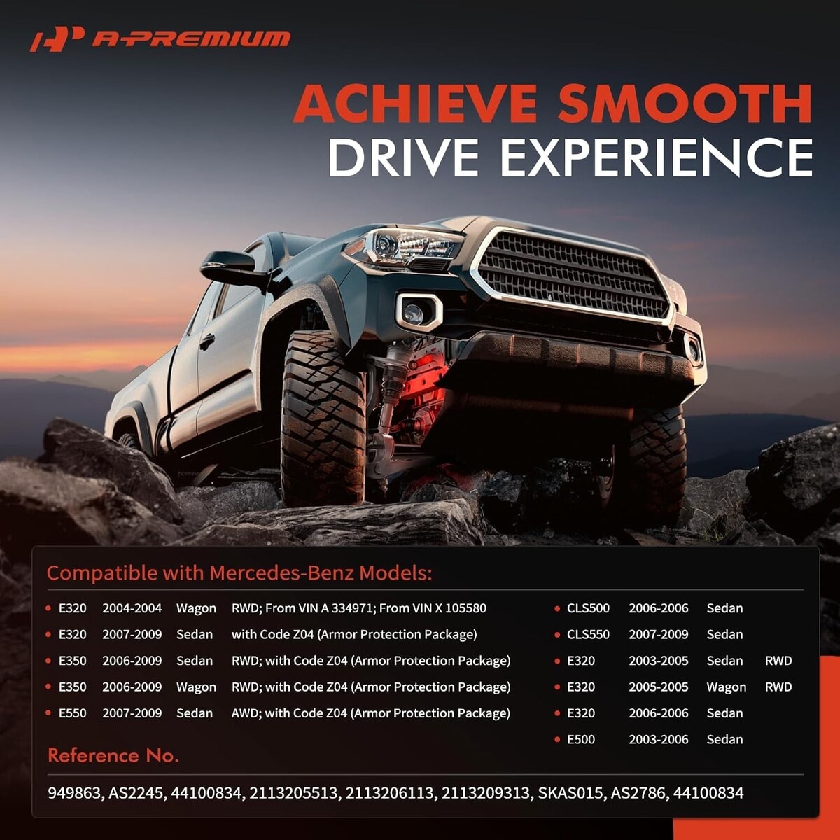 [Vehicle Fitment]: Compatible with Mercedes-Benz W211 Series E320 2004 Wagon (RWD; From VIN A 334971; From VIN X 105580), E320 2003-2005 Sedan (RWD), E320 2005 Wagon (RWD), E320 2006 Sedan, E500 2003-2006 Sedan, C219 Series CLS500 2006 Sedan, CLS550 2007-2009 Sedan