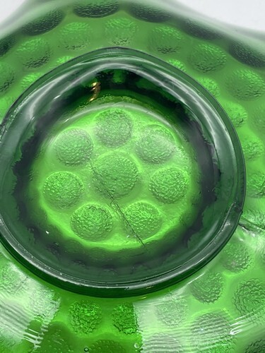 Overall, this gorgeous green piece piece looks to be in good condition, however, there are some air bubbles that show on the underside as well as thin crack lines - one in the bottom middle that appears to be like a cut mark and also there are obvious seams on the back. The photos are useful for seeing condition and other details.