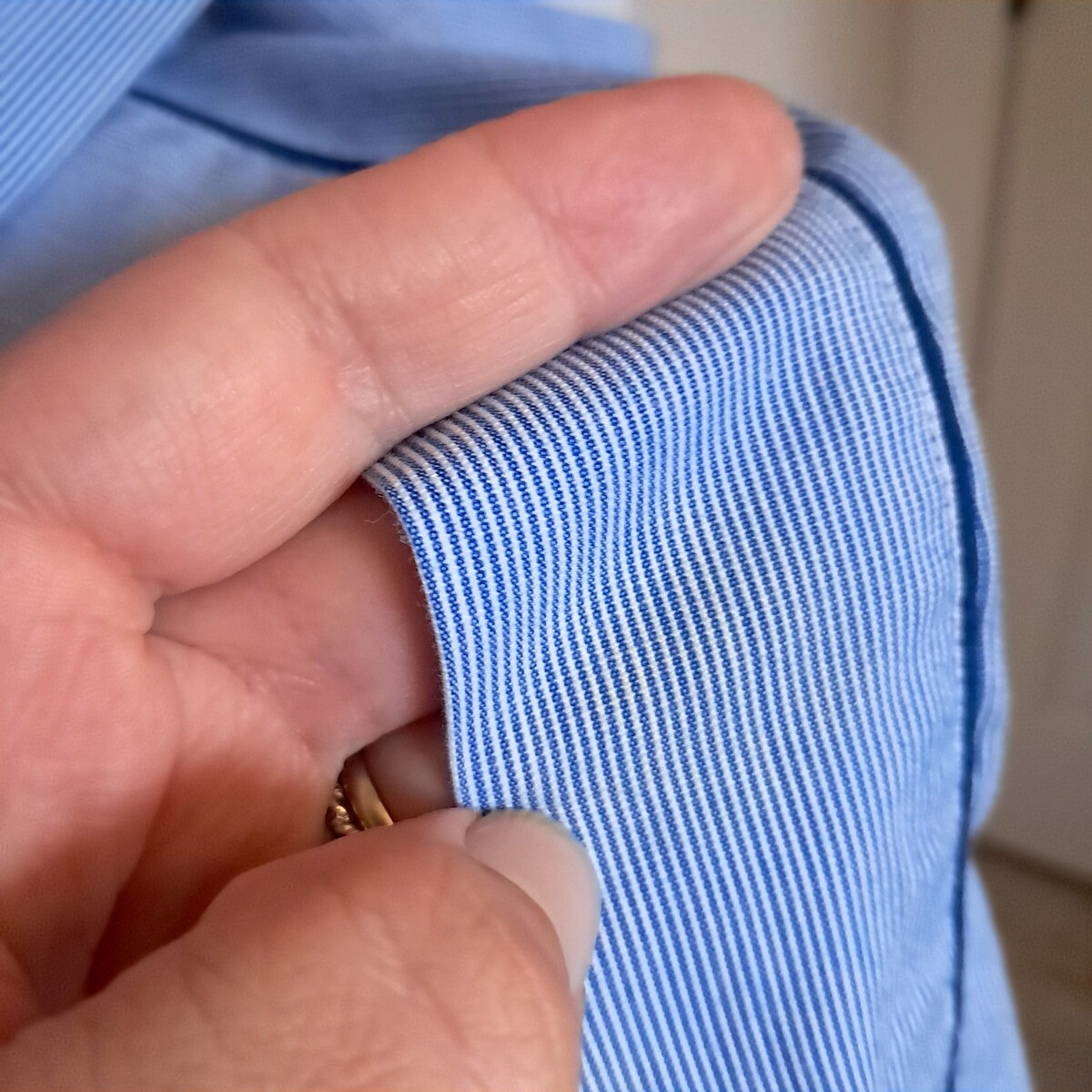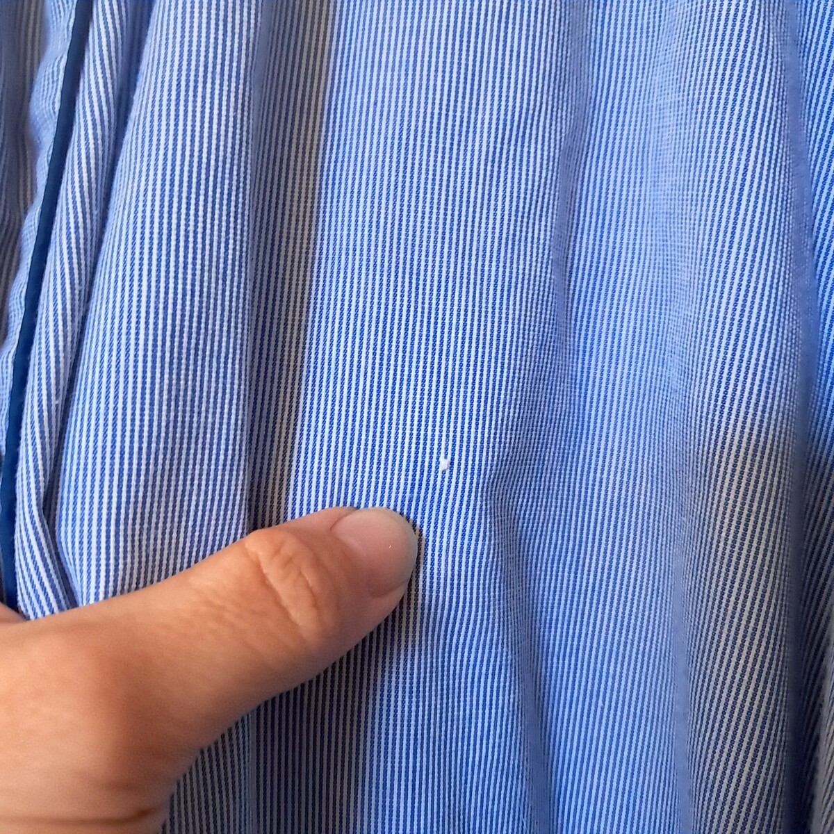 Cotton/poly blend. Thin robe with belt to tie. Some small light colored stains and a small hole at the hem and small pull at the collar, as shown. See pics.