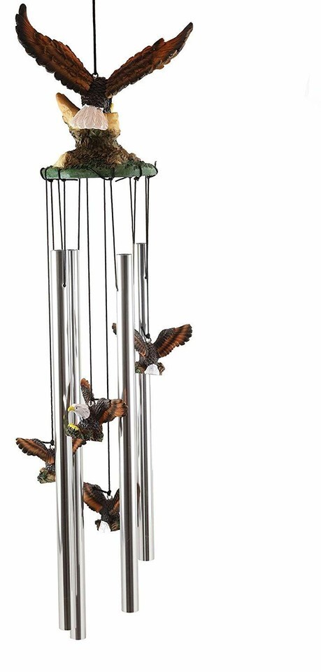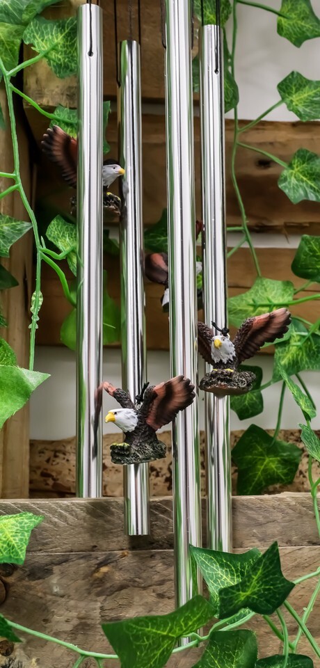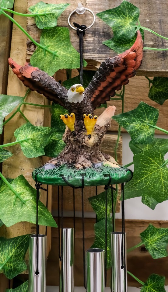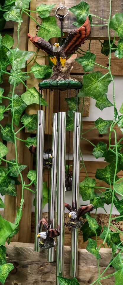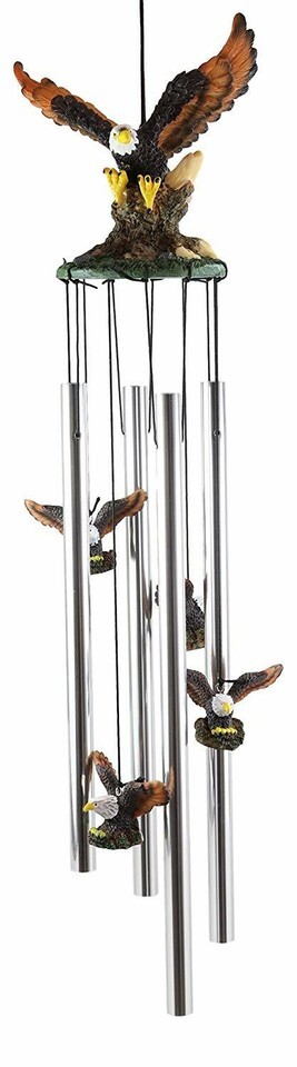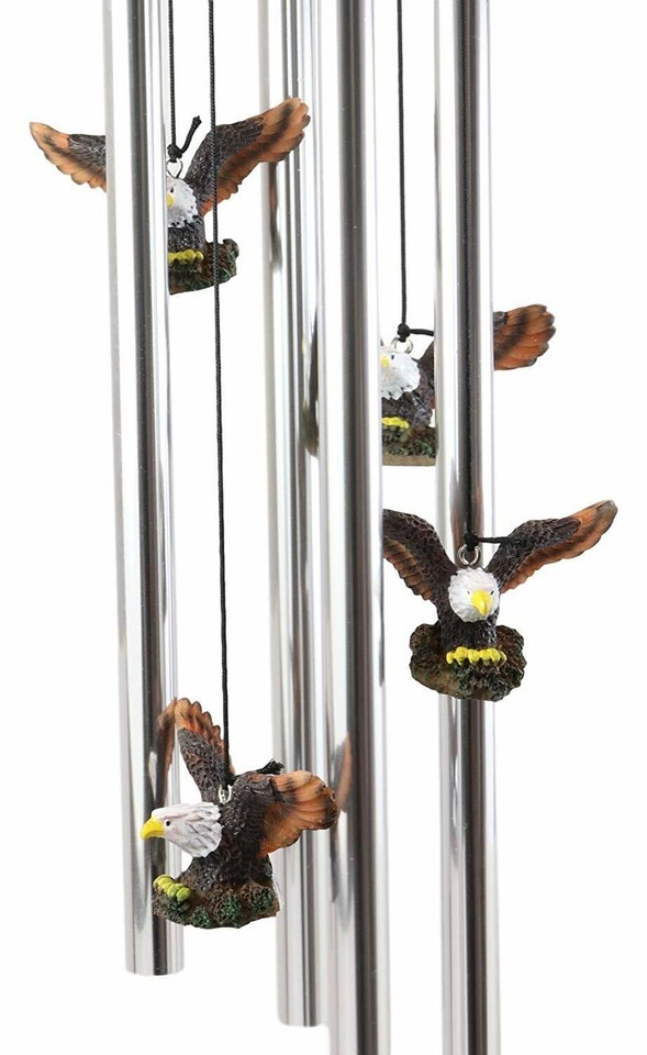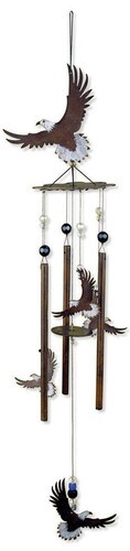 ? This decorative wind chime features a bald eagle spreading out its wings as it stretches out its talons swooping for prey. The Crown of the wind chime is a larger eagle sculpture while the base of the crown are aluminum rods attached by strings . Some of the strings also hold several miniature eagles similar to the crown to complete the decor.