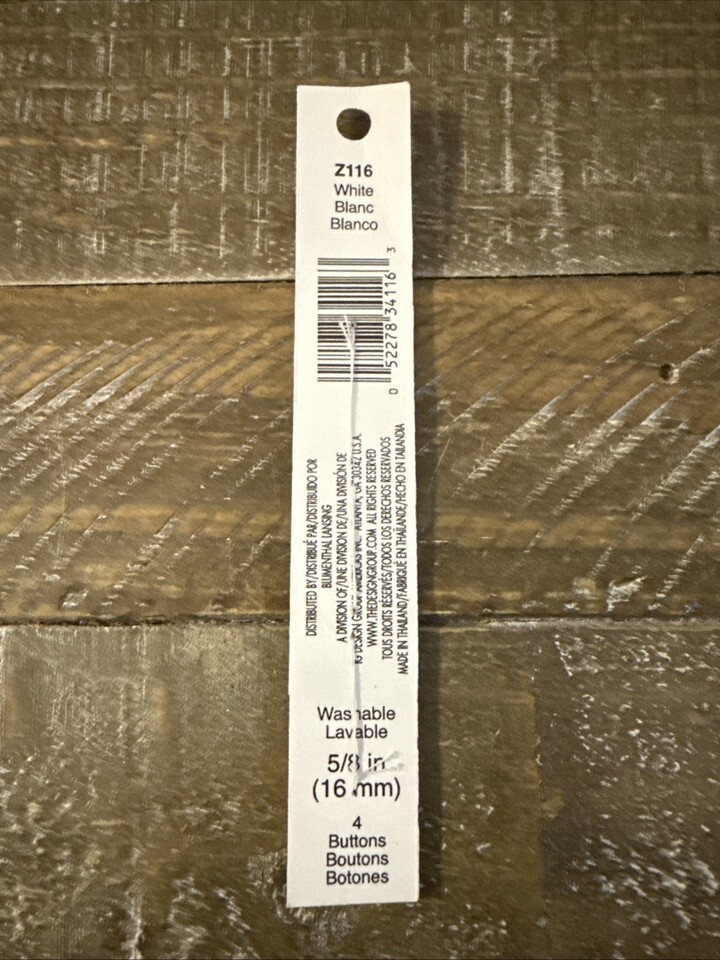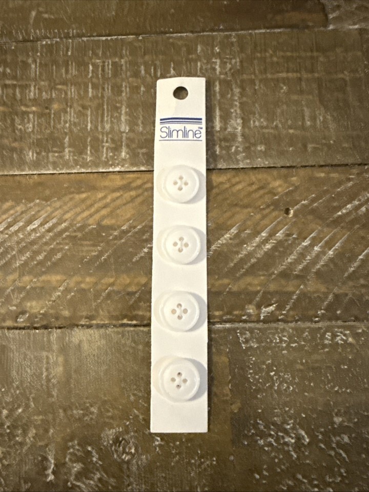 The SlimLine Buttons 4 Piece 5/8? are white plastic buttons perfect for crafting and sewing projects. These buttons are slim in design, providing a clean and sleek look to any project. Their size makes them versatile for a variety of uses, from adding closures to creating decorative accents. With four pieces included in the set, these buttons offer plenty of options for your creative endeavors.