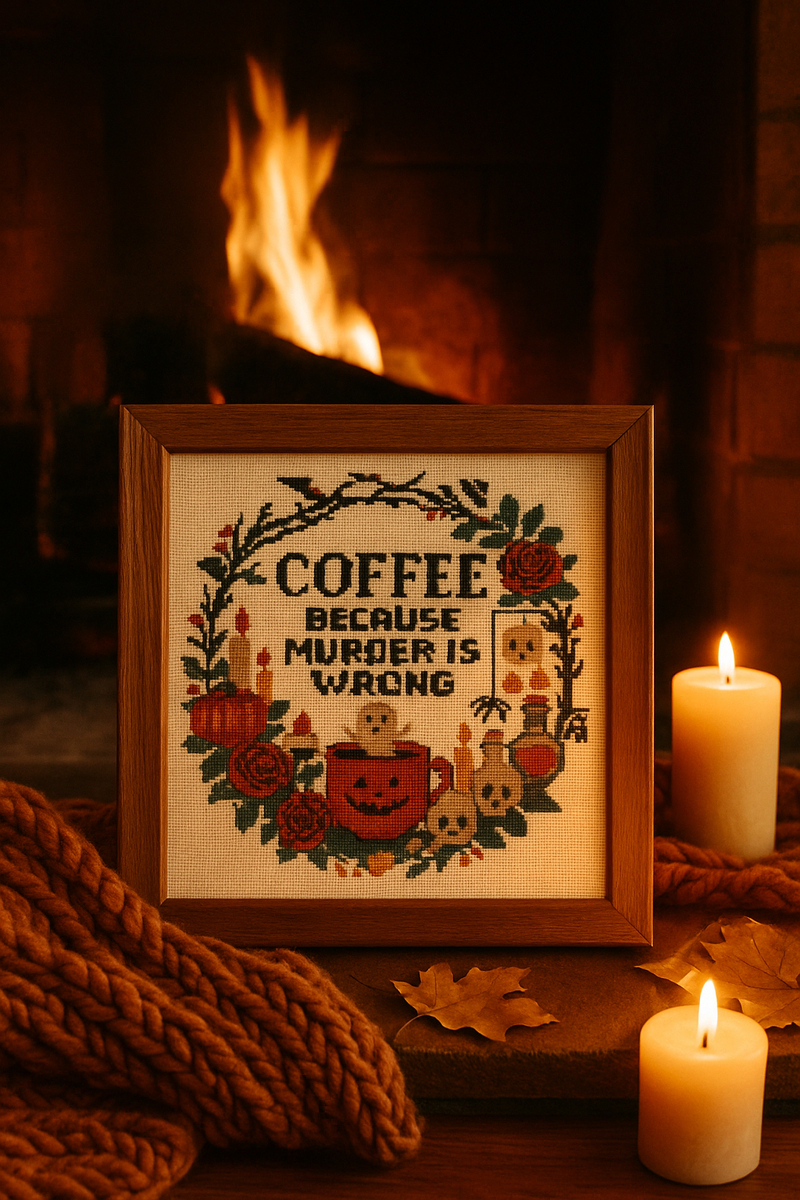 Bring humor, spookiness, and cozy fall vibes into your home with this Halloween cross stitch design “Coffee Because Murder Is Wrong.”