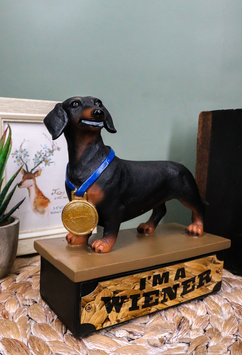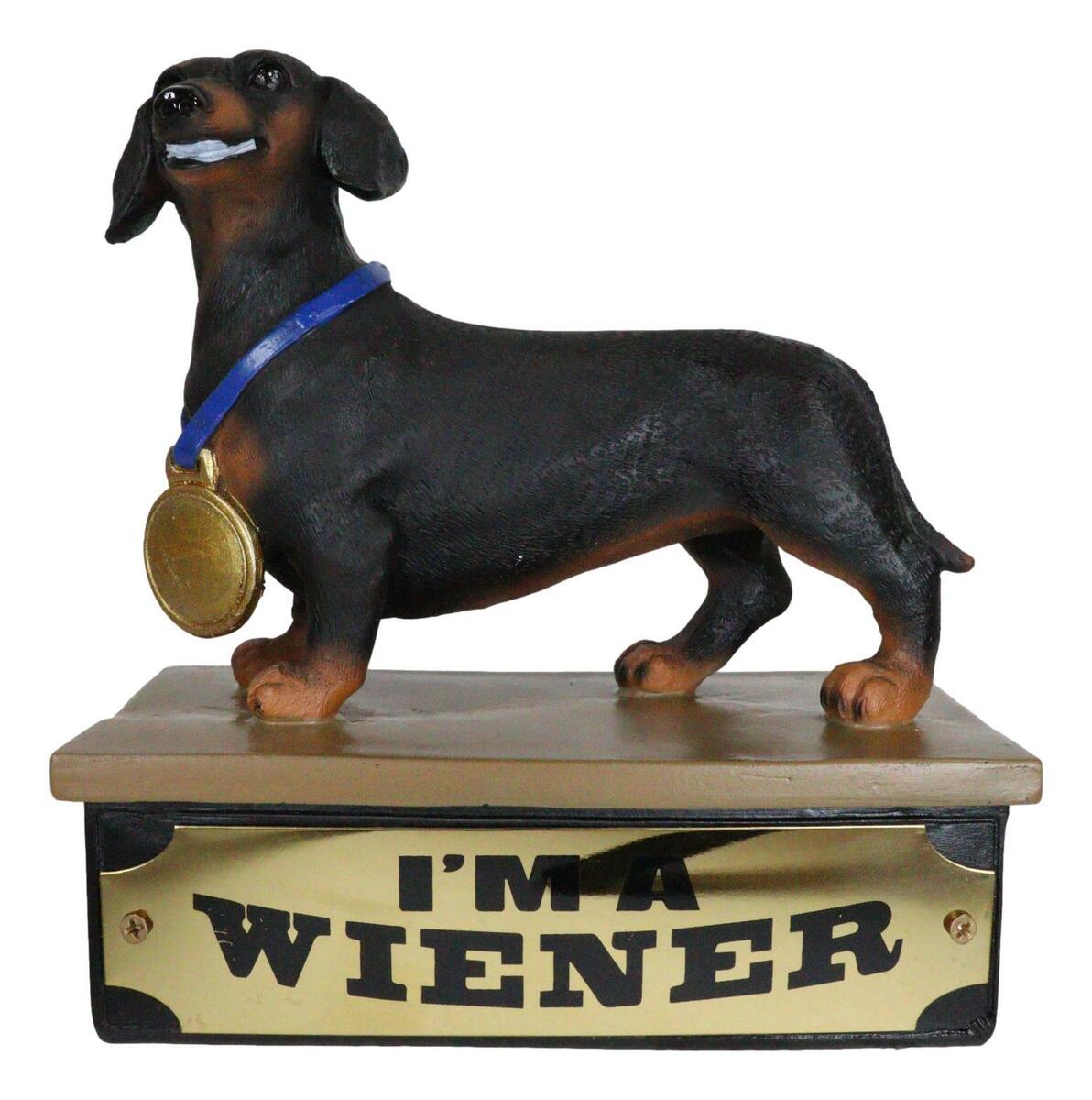 ? A lighthearted accent sculpture for your mantel, shelf, desktop at home or office. Also perfect as a prize award for cooking, hot dog eating challenge or any contests/races. Featuring a handsome sausage dog smiling with perfect white teeth and a blue collar gold medal around its neck. It stands on a podium with the words 'I'm A Wiener' engraved onto a brass plate.
