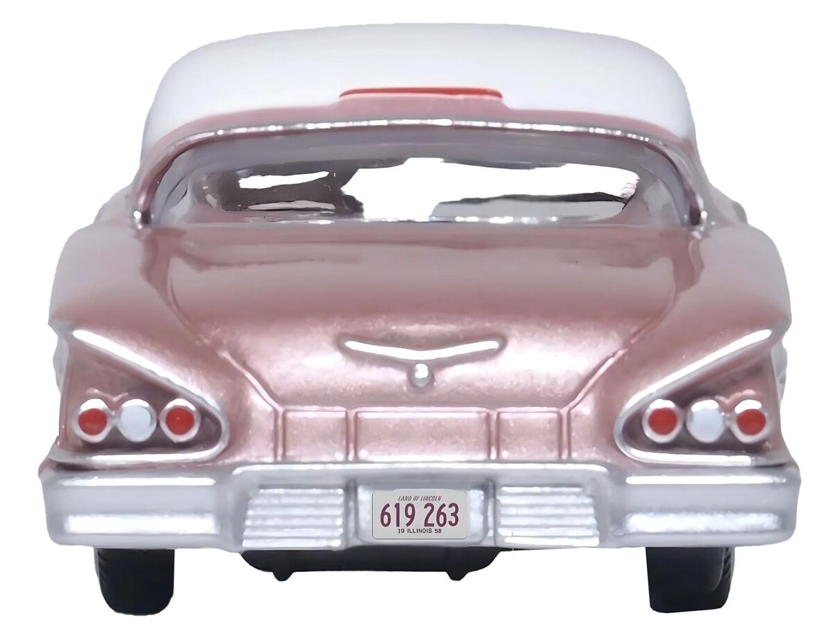 Brand new 1/87 (HO) scale diecast car model of 1958 Chevrolet Impala Sport Cay Coral Pink Metallic with White Top die cast model car by Oxford Diecast. Brand new box. True-to-scale detail. Detailed interior, exterior. Officially licensed product. Does not have any openings. Comes in plastic display showcase. Manufacturer's original unopened packaging. Made of diecast metal with some plastic parts. Dimensions approximately L-2.25 inches long.