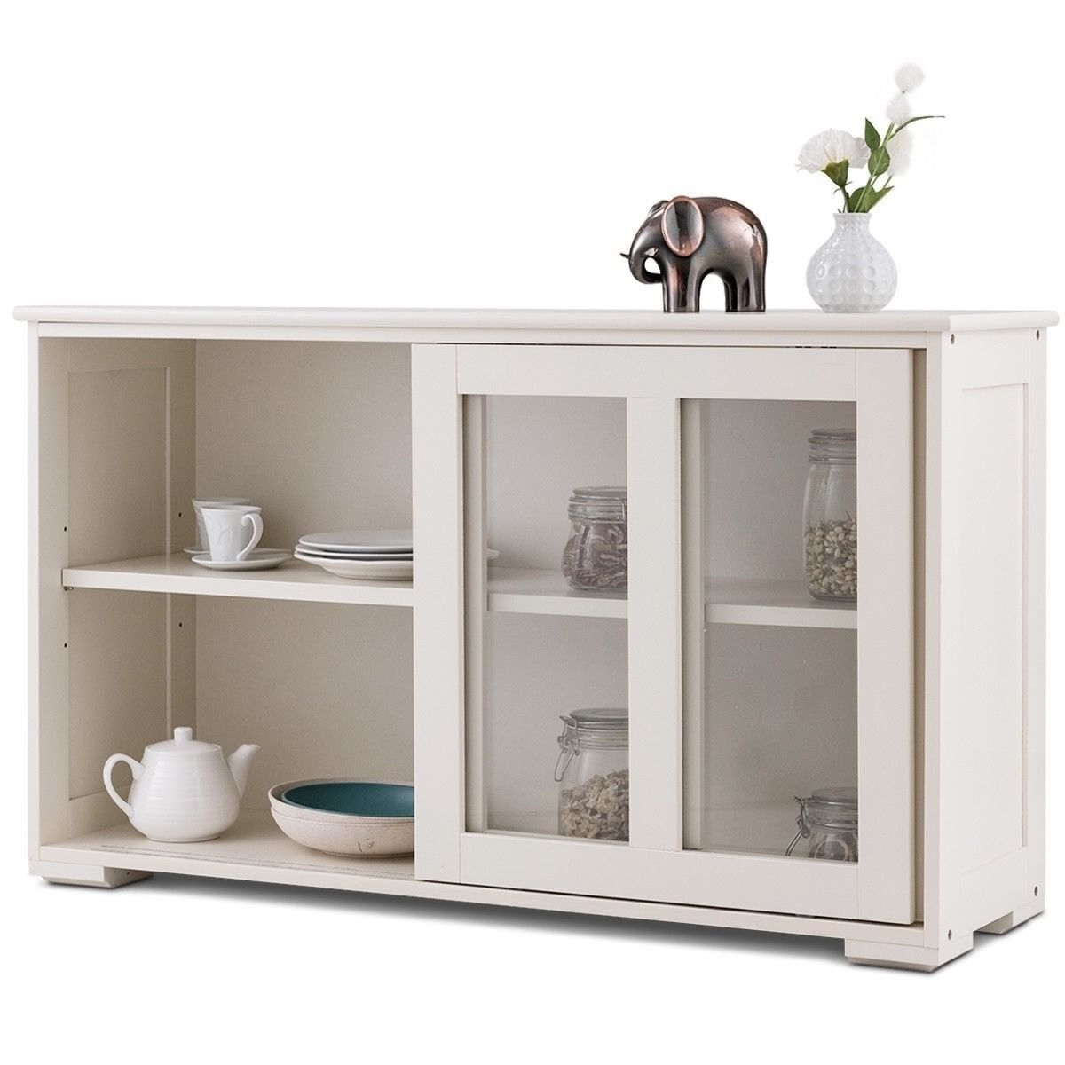 CThis Modern White Wood Buffet Sideboard Cabinet with Glass Sliding Door is perfect to fit your kitchen or dining room and provides you with unmatched convenience. It features a big sliding-door storage compartment for all your kitchen gadgets and tools, making it tremendous value as well as a great space saver for your kitchen. The cabinet has a spacious top that is great for storage or display. The clear glass doors help you see the items in your cupboard. The solid wood construction provides years of sturdy and reliable use. Host dinner parties and prepare great meals with this wonderful kitchen cabinet!