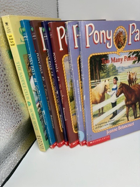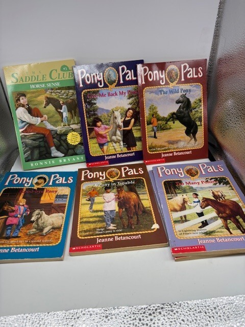There are 6 Pony Pal books and one The Saddle Club. They are older books from the mid to late 1990's. They have name stamps inside the front cover, but no torn or missing pages.