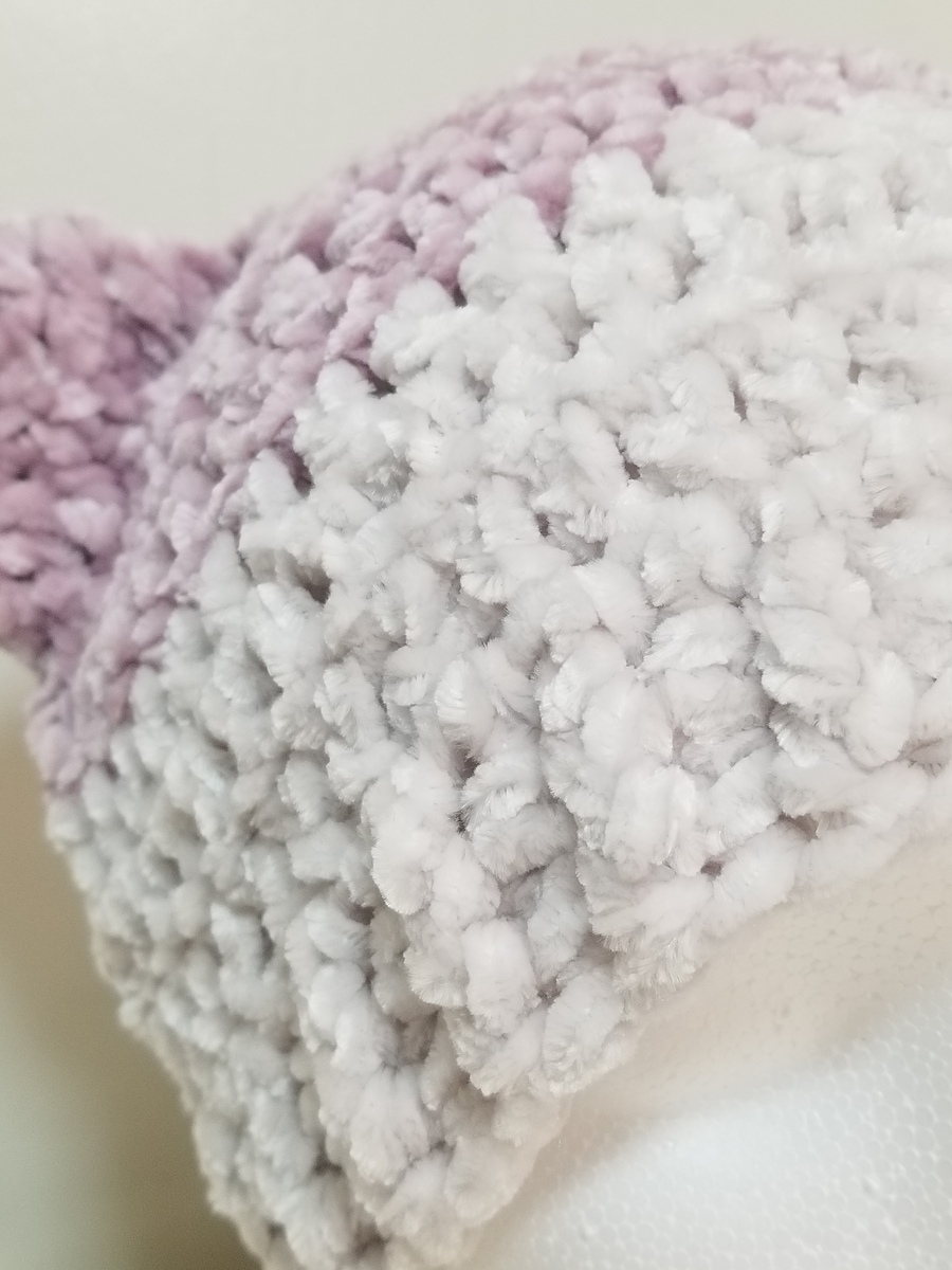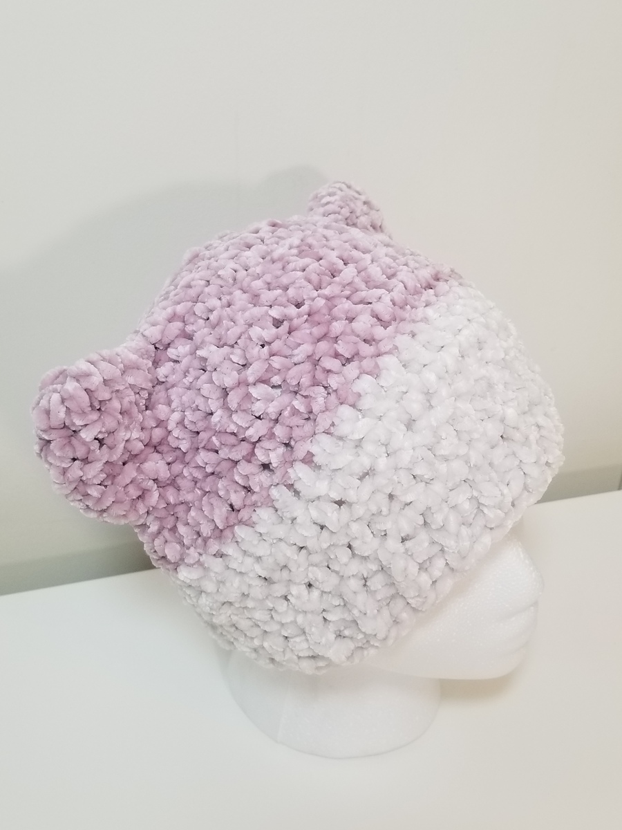 Handmade Crocheted Velvet Cat Ear Beanie Hat in Pink White Two-Tone style! Hat is made from very soft 100% polyester velvet yarn. Perfect for a gift or to keep you warm and cute!