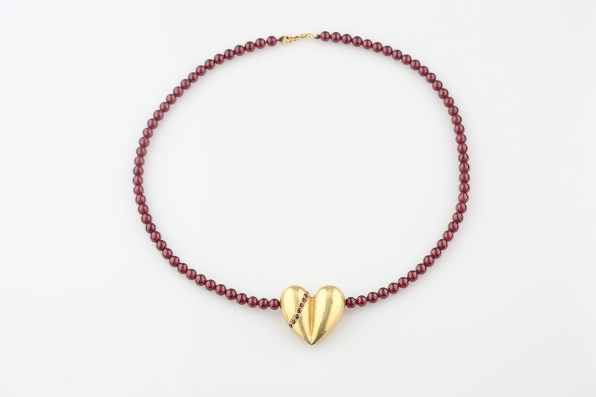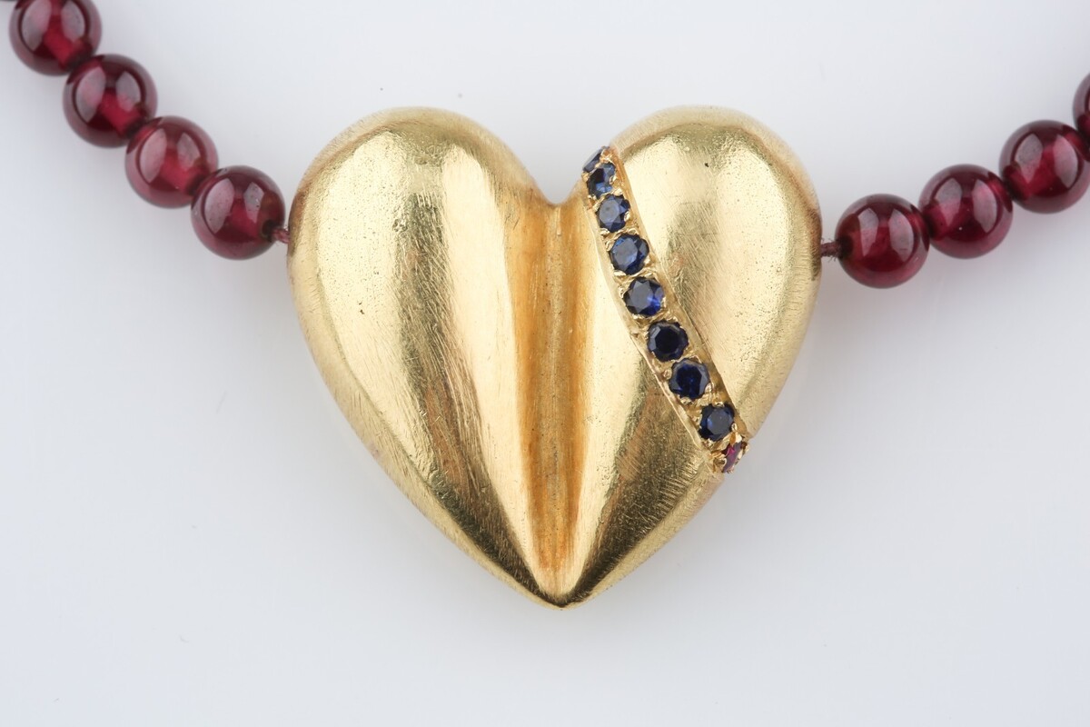 Kieselstein-Cord 18k Gold Heart Necklace w/ Ruby Sapphire on Garnet Strand
