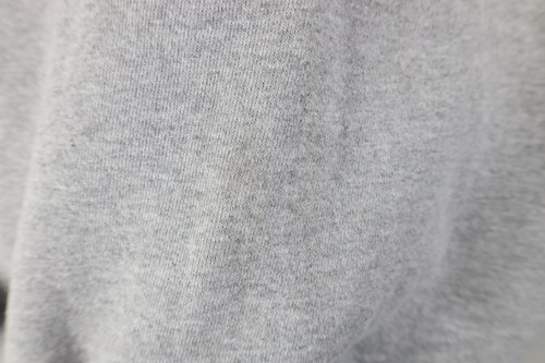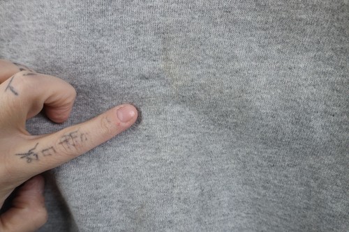 Blemish front middle. Design, logo distressed. Loose threads tag. Color faded. Pilling
