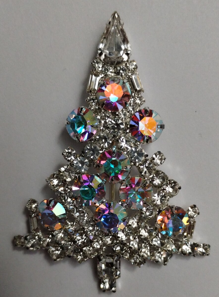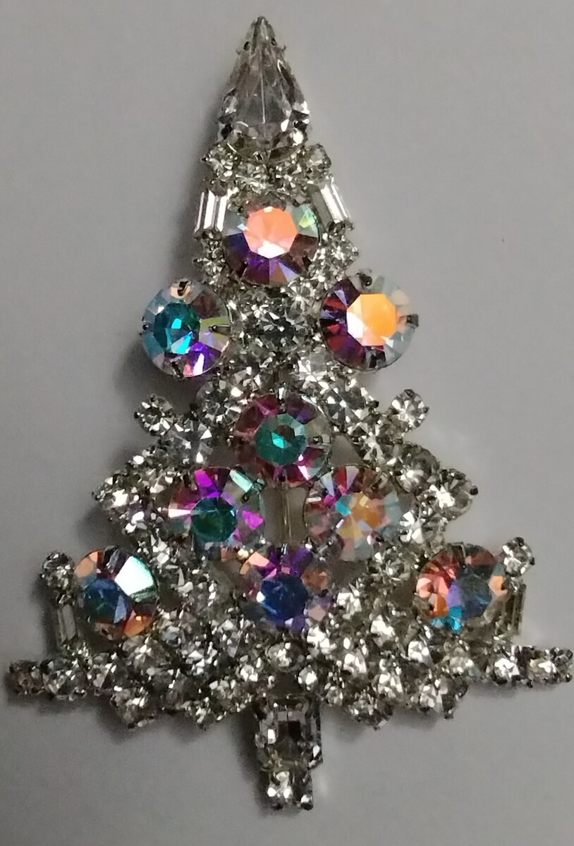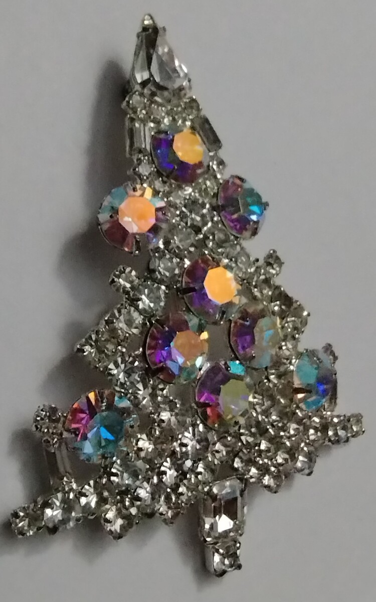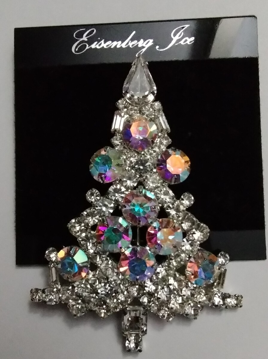 Eisenberg Ice clear rhinestone candle tree with large round Aurora Borealis stones set as ornaments. This sparkler is textural eye candy with a delightful mix of round and baguette stones, with the emerald cut base and the pear cut candle top. All stones are prong-set in a silvertone setting. It has a rollover clasp pin bar. Signed. Measures 2-7/8" tall and 2" at the widest point. In excellent condition. Never worn.