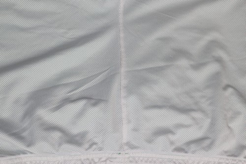 Reversible. White side: String, logo distressed. Green side: Blemishes front right leg. Logo distressed. Color faded