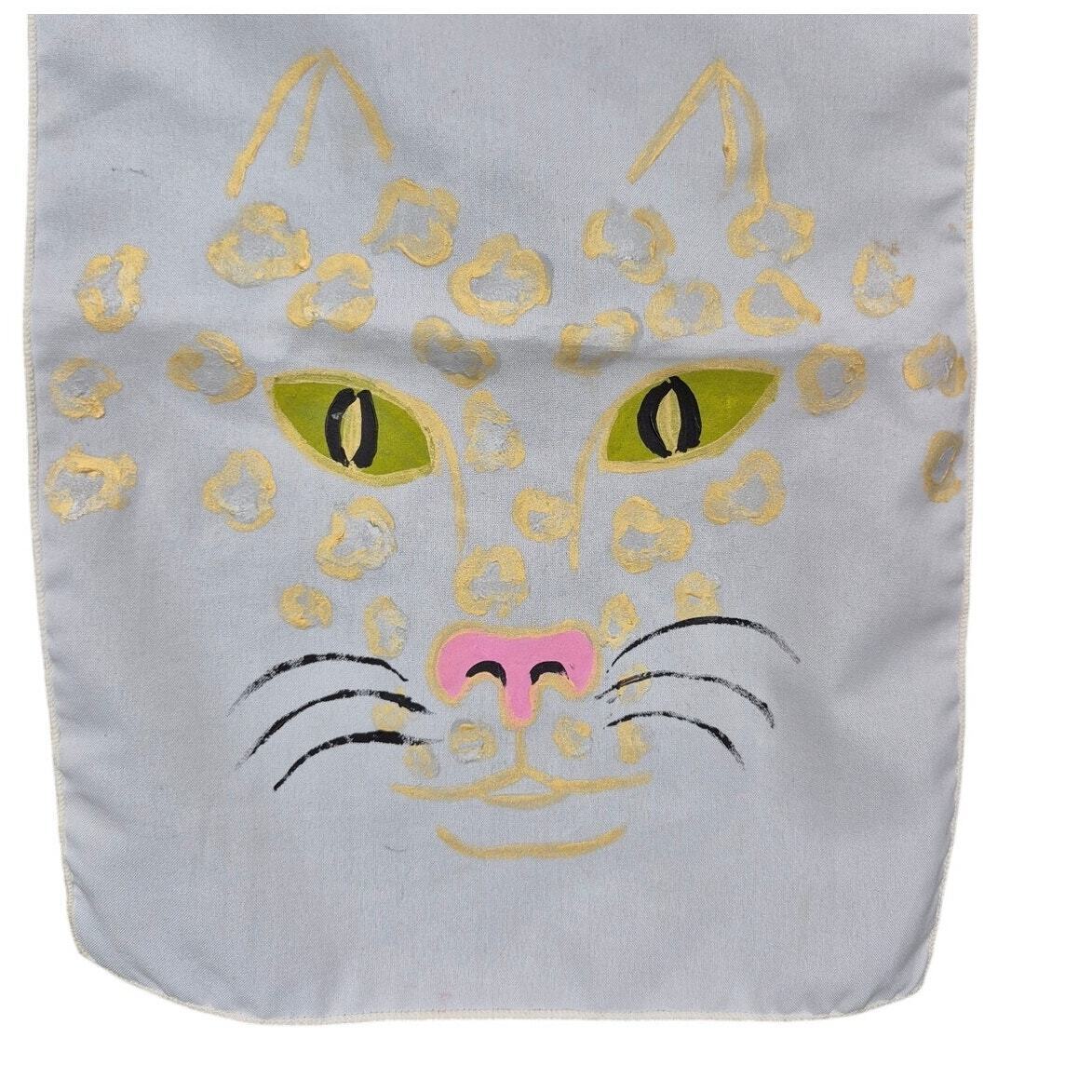 vintage White Hand Painted Kitty Cat Leopard Scarf 1970s Acetate- it has some very light faint stains on the white, but the cat part is unique and good.