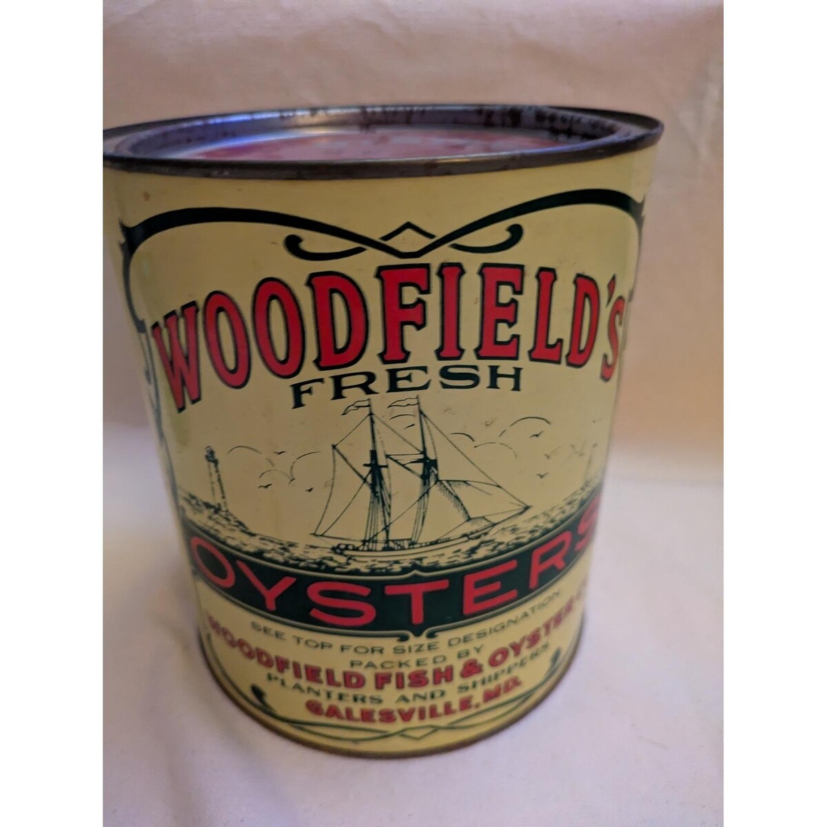 Woodfields Fresh Oysters Vintage Tin 1 Gallon Can Galesville MD Collectible