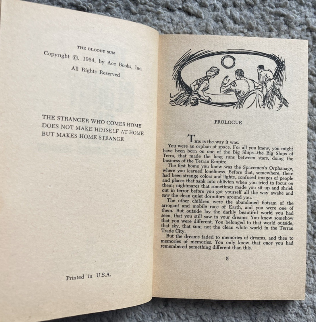 Vintage 192 page mass market paperback titled THE BLOODY SUN by Marion Zimmer Bradley/ ACE Books ISBN #0-441-06853-7, Copyright 1964, $1.75 cover price, Later 1970's Printing / Jeff Kerwin spent the first decade of his life in the Spacemen's Orphanage in the Terran Trade City on Darkover. Yet he never felt that he belonged. When Jeff is shipped back to Earth at the age of 12, he becomes haunted by dreams of the world surrounding the Terran oasis that had once been his. He is convinced that only on Darkover can he discover his true identity. Now an adult, Jeff finally returns to Darkover as a member of the Terran Spaceforce. Still, he feels out of place. Despite being mistaken for a member of the Comyn aristocracy with his red hair and possession of a powerful matrix jewel, he has no memory of how he acquired such things. If only he could learn the secrets of the Towers, perhaps then he could hope to solve the mystery of his heritage.