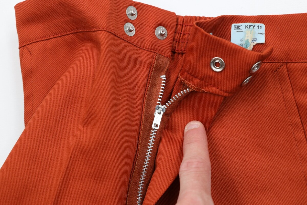 New with Defects. Pen mark on left leg. Musty scent. USA made. Has patches on the inner knees for reinforcement