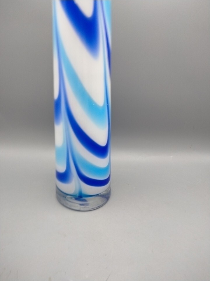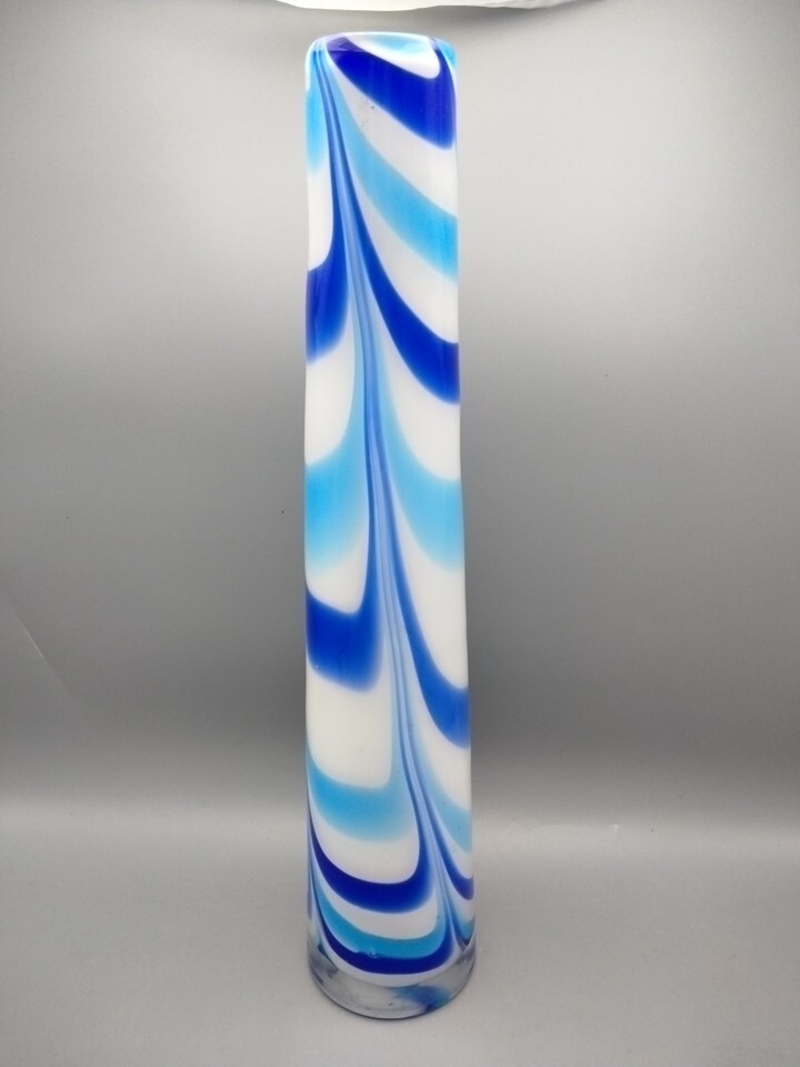 Vintage MCM Blown Art Glass Blue Teal White Swirl 16" Tall Curved Vase